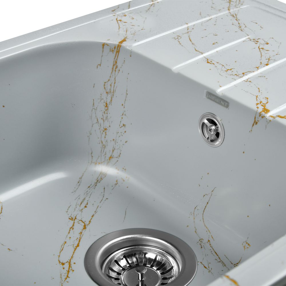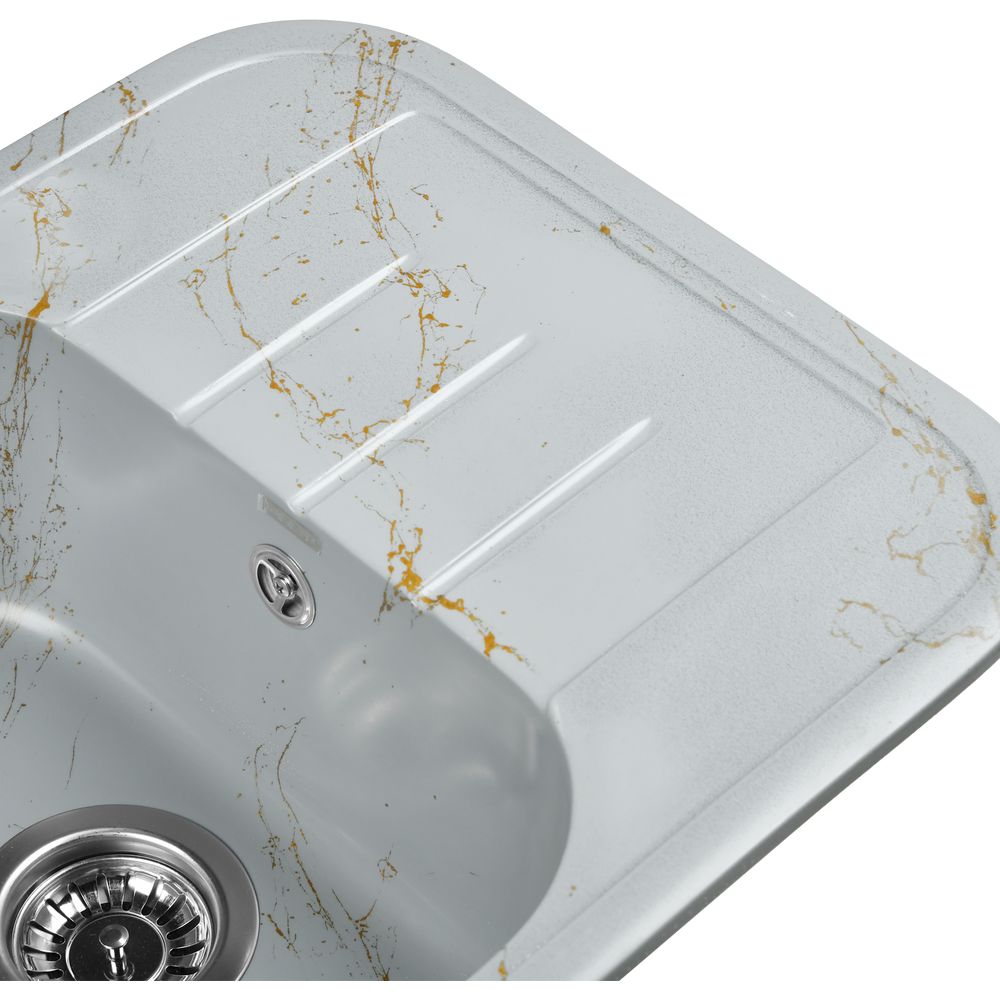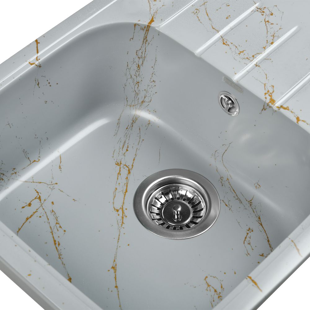 Эта впечатляющая кухонная мойка Wisent WB20-15 из серии "Мрамор серо-золотой" приносит стиль и функциональность в любую кухню. Изготовленная из искусственного гранита, мойка не только имеет изысканный глянцевый вид, но и обладает устойчивостью к термоудару до 180 градусов. Она не впитывает пищевые красители, а также снабжена защитой от микро-царапин, ультрафиолета и грибков, что гарантирует долговечность и эстетическую привлекательность изделия. Пространственное армирование обеспечивает дополнительную прочность, а низкое температурное расширение исключает подвижность мойки на столешнице, сохраняя гидроизоляцию кромки.