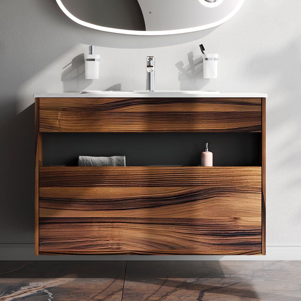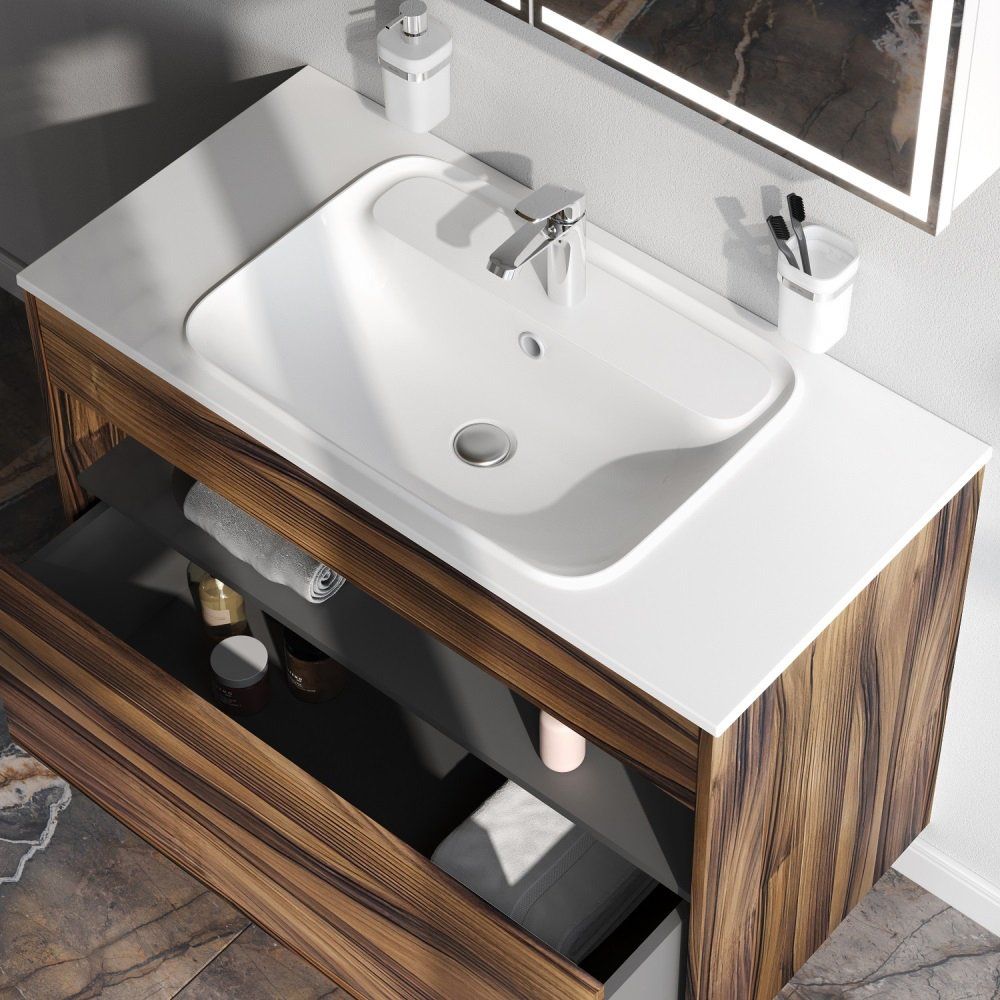 Комплект мебели включает стильную тумбу измерением 100x49x70 см, выполненную из ЛДСП с ламинатным покрытием, что гарантирует долгий срок службы и устойчивость к воздействию влаги. В набор также входит матовая белая раковина из искусственного мрамора размером 100,8x49,2 см, совместимая с сифоном диаметром 3.2 см (донный клапан приобретается отдельно). Зеркало оборудовано светодиодной подсветкой и инфракрасным сенсором, его размеры составляют 100x3,5x80 см. Все элементы произведены с вниманием к деталям и функциональности в Германии и имеют гарантию 3 года.