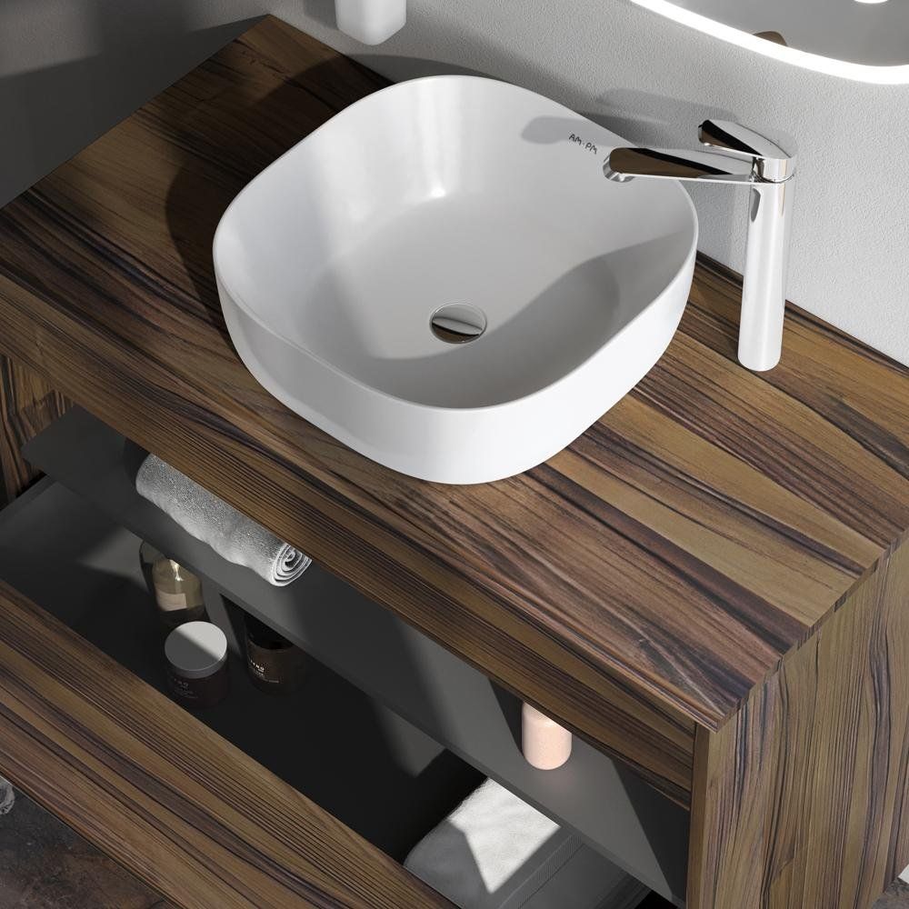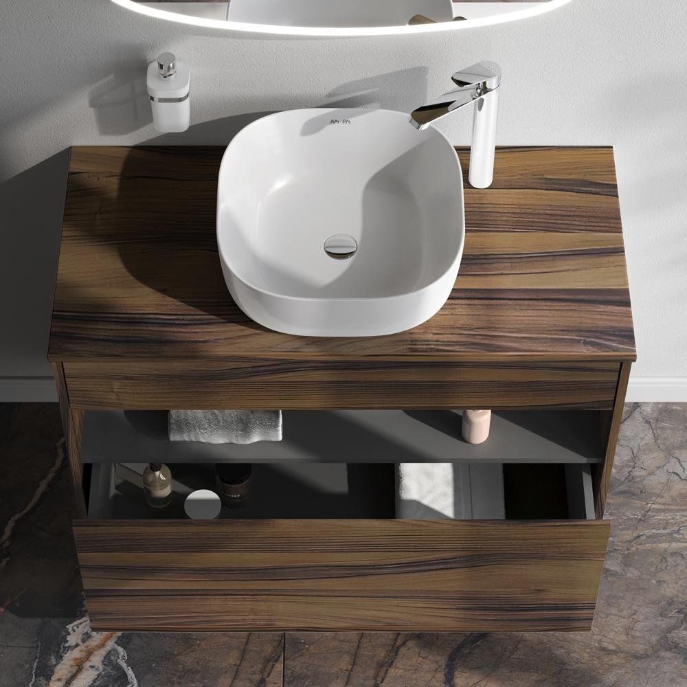 Тумба AM.PM Func 100, выполненная из ЛДСП с ламинатным покрытием, имеет размеры 100x49x70 см и может монтироваться напольно или подвесно. Оснащена доводчиком для плавного закрывания. В комплект также входит зеркальная панель с регулируемой светодиодной подсветкой и инфракрасным выключателем, что помогает создать идеальное освещение. Мебельная раковина из фарфора диаметром 43 см имеет устойчивое белое глянцевое покрытие и рассчитана под стандартный сифон 3.2 см.