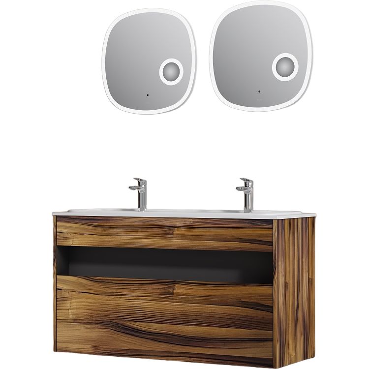 Гарнитур состоит из нескольких основных элементов. Тумба AM.PM Func 120 дуб крафт, выполненная из ЛДСП с ламинатным покрытием, имеет габариты 80x49x70 см и может быть как напольной, так и подвесной. Оснащена механизмом доводчика для плавного закрывания ящиков. Материал фасада — ЛДСП с ламинатным покрытием.