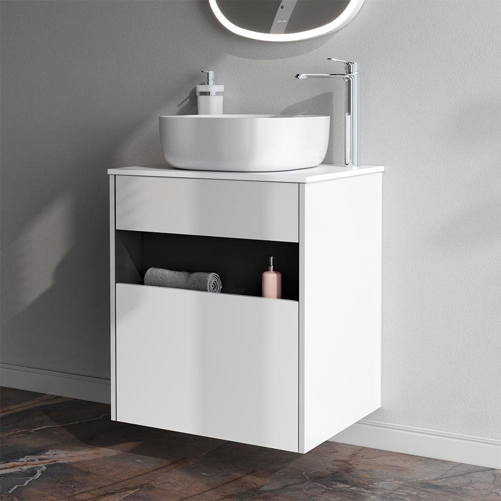 Мебельный гарнитур совместим с напольным и подвесным монтажом. Имейте в виду, что комплект ножек, необходимые для напольного монтажа, нужно приобретать отдельно. При выборе сифона обратите внимание на параметры раковины и конструкции тумбы. Столешница поставляется без отверстий под смеситель, что позволяет выполнить индивидуальную настройку.