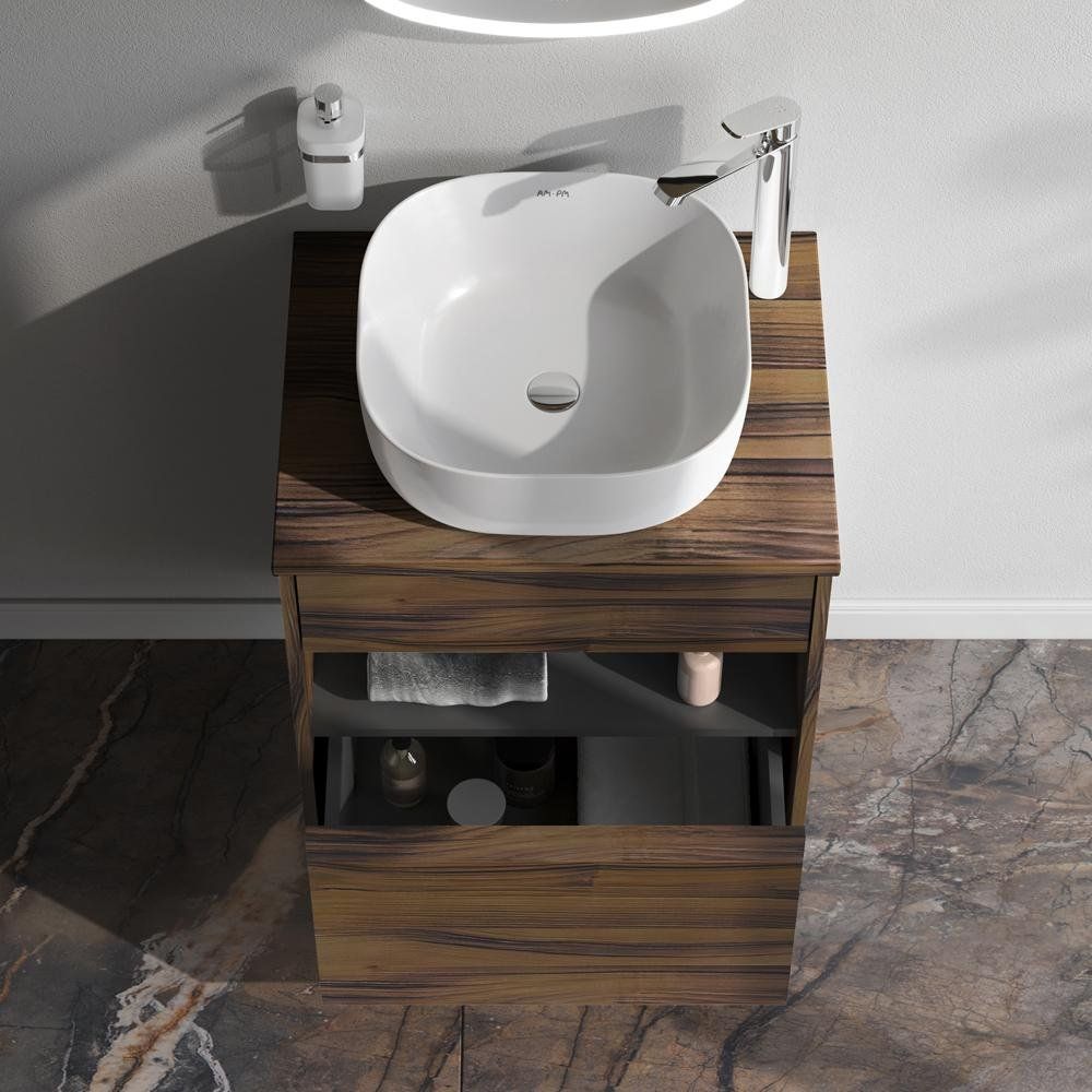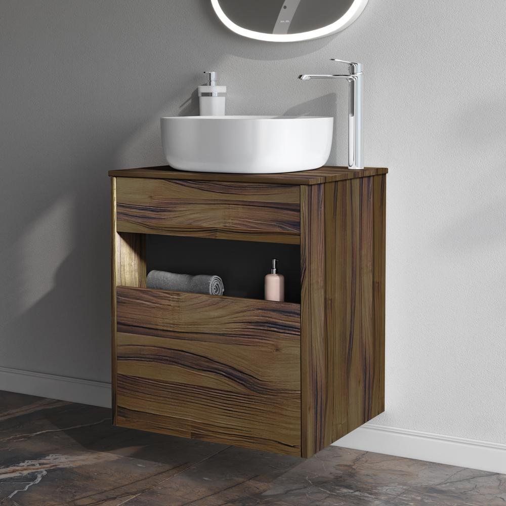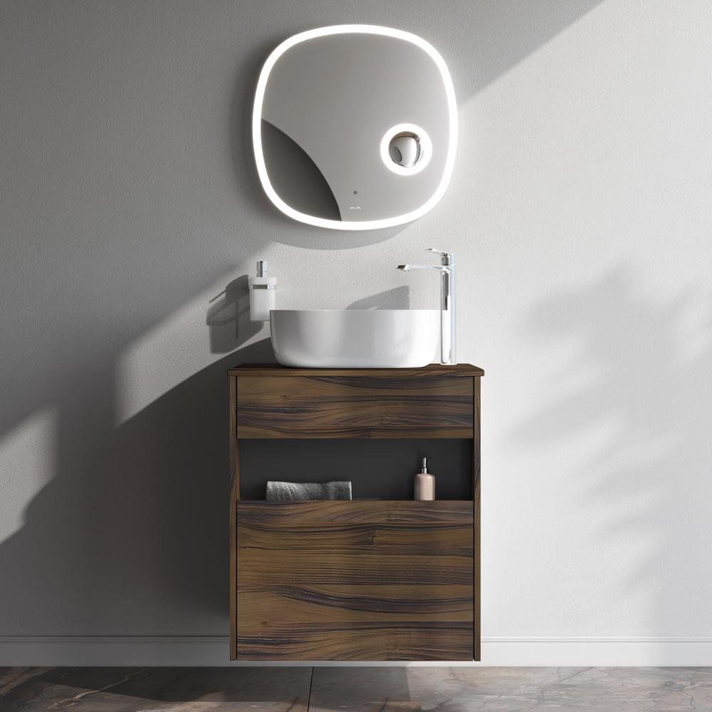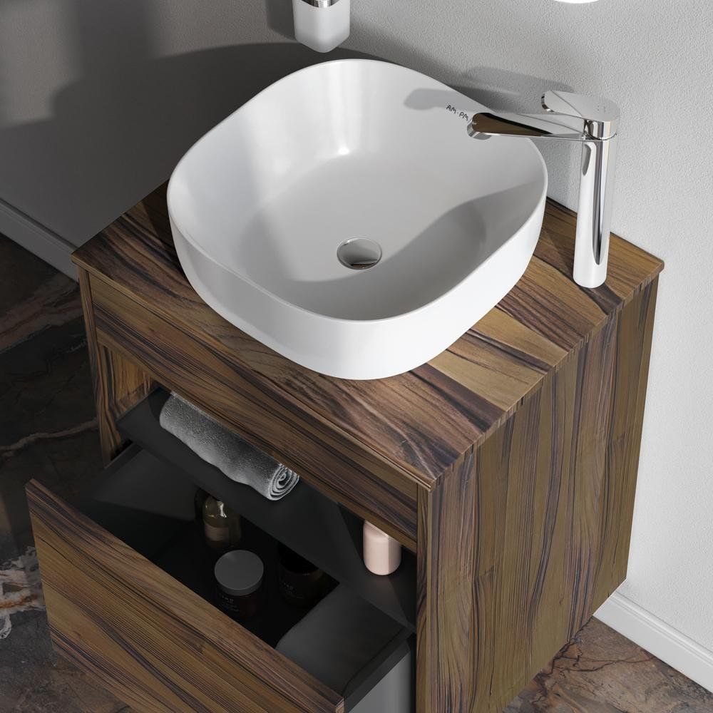 Раковина AM.PM Func M8FWCC30430WG, диаметром 43 см, изготовлена из прочного фарфора. Она устанавливается с необходимым диаметром сифона 3.2 см, который приобретается отдельно. Столешница AM.PM Func 60 из ЛДСП, шириной 60.4 см, без готовых отверстий под смеситель.