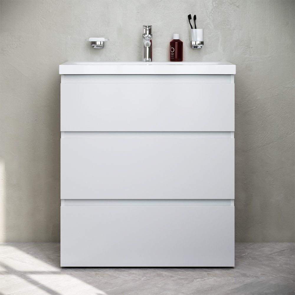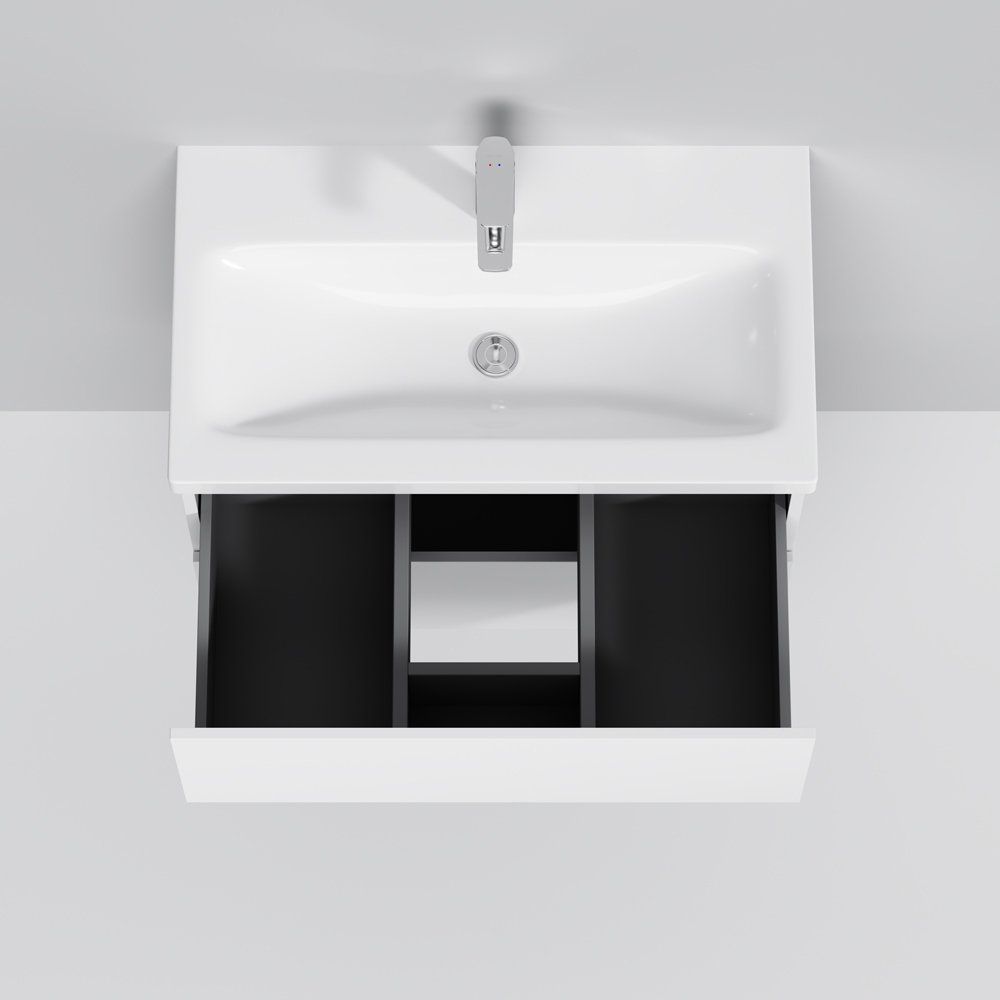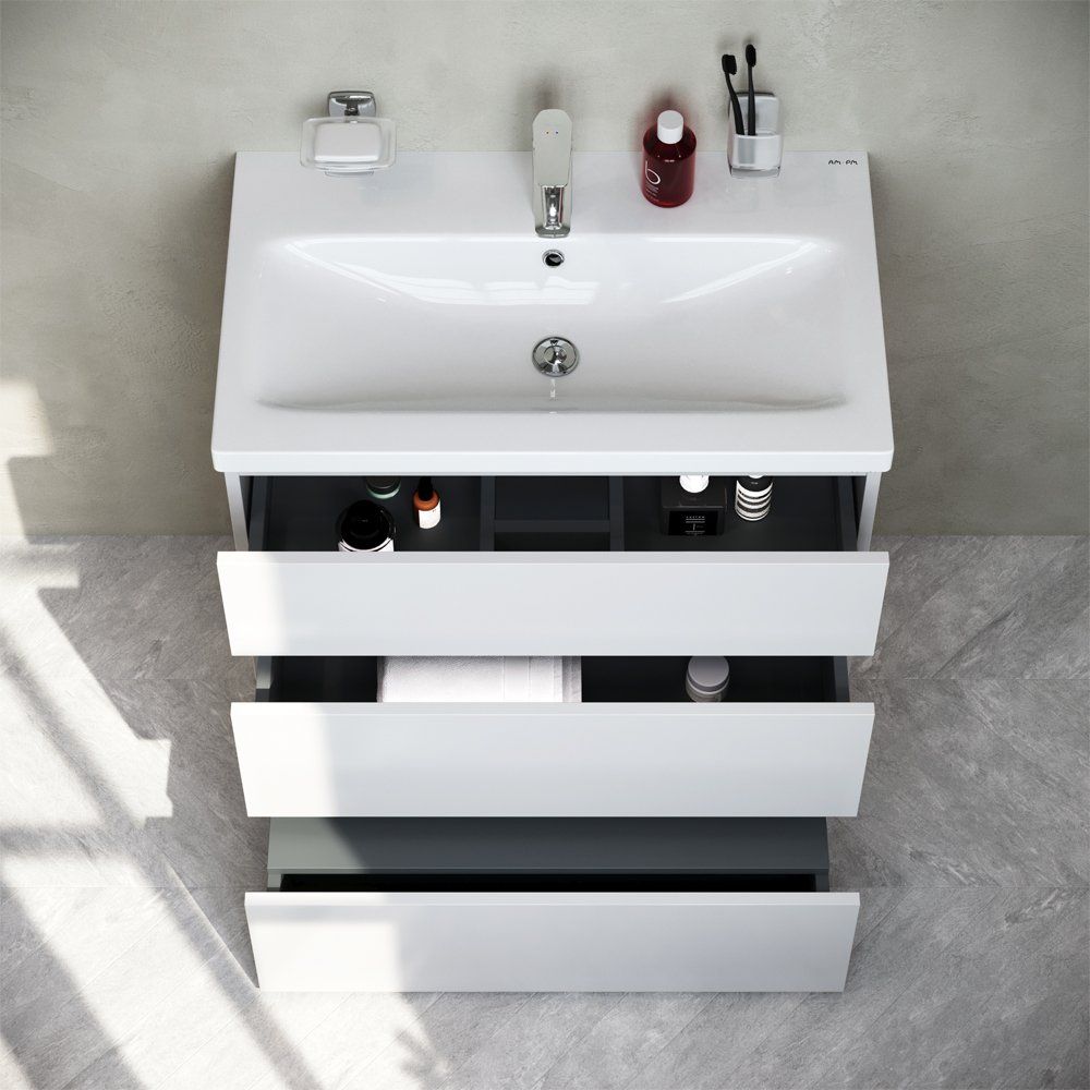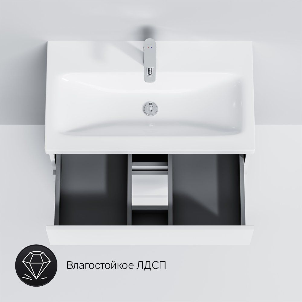 Тумба AM.PM Gem S 75, размерами 75x42,5x81 см, выполнена из ДСП с эмалевым покрытием и оснащена механизмом доводчика, ящиками и опорными ножками. Комплектуется мебельной раковиной из фарфора размером 76x41,5 см с встроенным сливом-переливом, одно готовое отверстие под смеситель. Зеркало AM.PM Gem 80 с ламинатным покрытием имеет размеры 80x3x70 см, снабжено периметрической подсветкой и механизмом подвеса для удобного размещения. Общая гарантия на все элементы комплекта составляет 3 года.