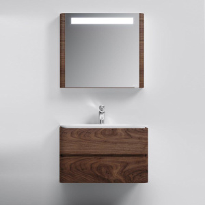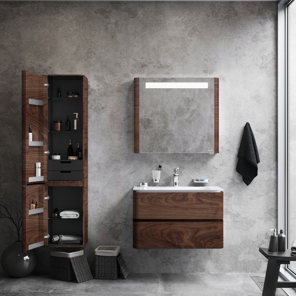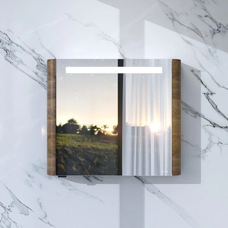 Зеркало-шкаф AM.PM Sensation R 80, орех: размеры 80x15x70 см. Корпус выполнен из МДФ с элегантным покрытием из шпона. Зеркало оснащено встроенной подсветкой и сенсорным выключателем, розеткой и системой доводчиков на дверцах.