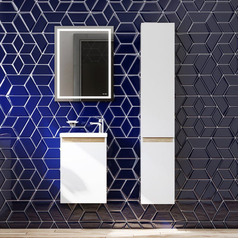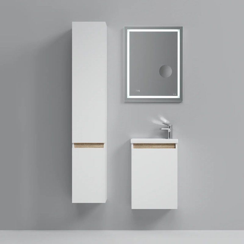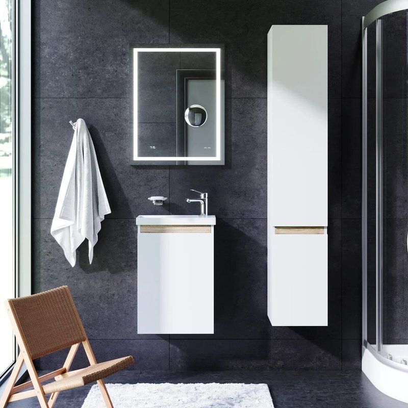 Тумба для комплекта AM.PM X-Joy 45 имеет габариты (Ш Г В): 42,5x24,8x58 см и подвесную конструкцию, что обеспечивает легкость установки. Корпус выполнен из ламината ЛДСП/ДСП, тогда как фасад изготовлен из МДФ и покрыт акрилом и эмалью. Внутренние съемные полки и дверки добавляют практичности. Раковина из фарфора с габаритами 44x25 см оснащена встроенным сливом-переливом и рассчитана на сифон диаметром 3.2 см. Зеркало AM.PM Gem 55 включает LED-подсветку и часы, а также предусмотрено оптическое косметическое зеркало с увеличением. Все эти элементы произведены в Германии и имеют соответствующие гарантии: 3 года на мебельный комплект и 25 лет на раковину.