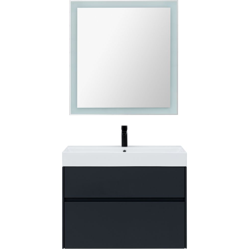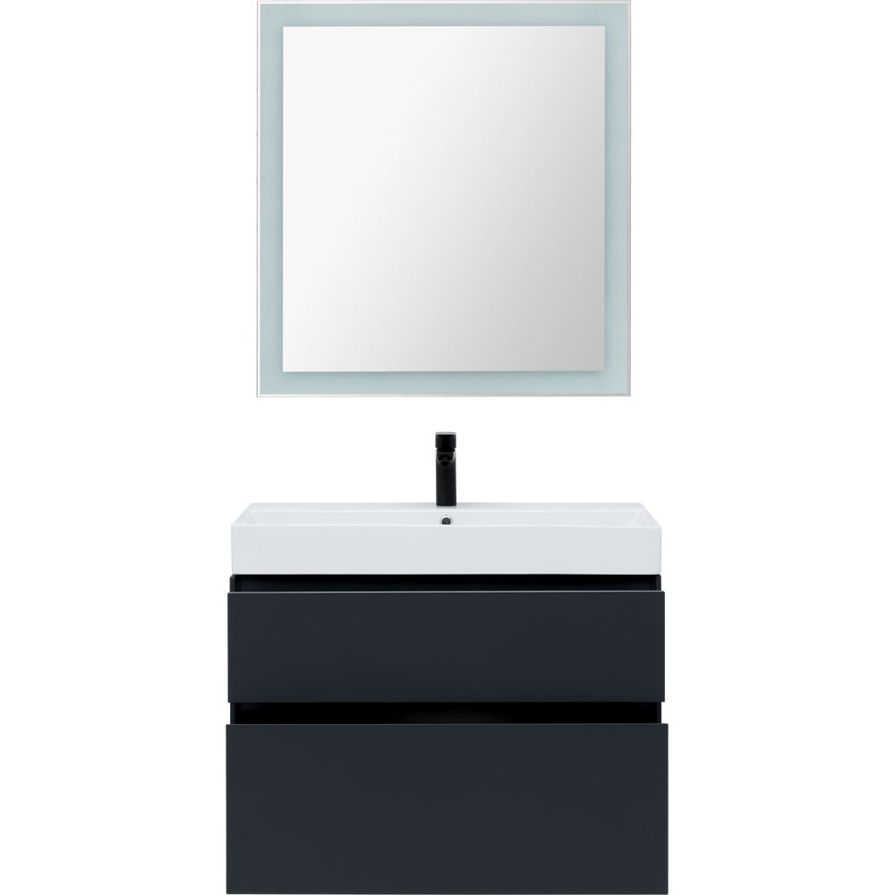 Зеркало: Габариты 80x3,2x85 см, с пластиковой рамой и сенсорным выключателем подсветки. Оснащено системой антизапотевания.