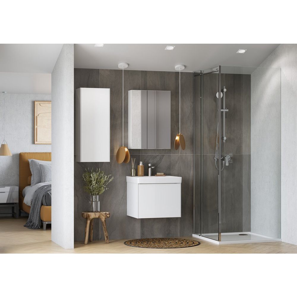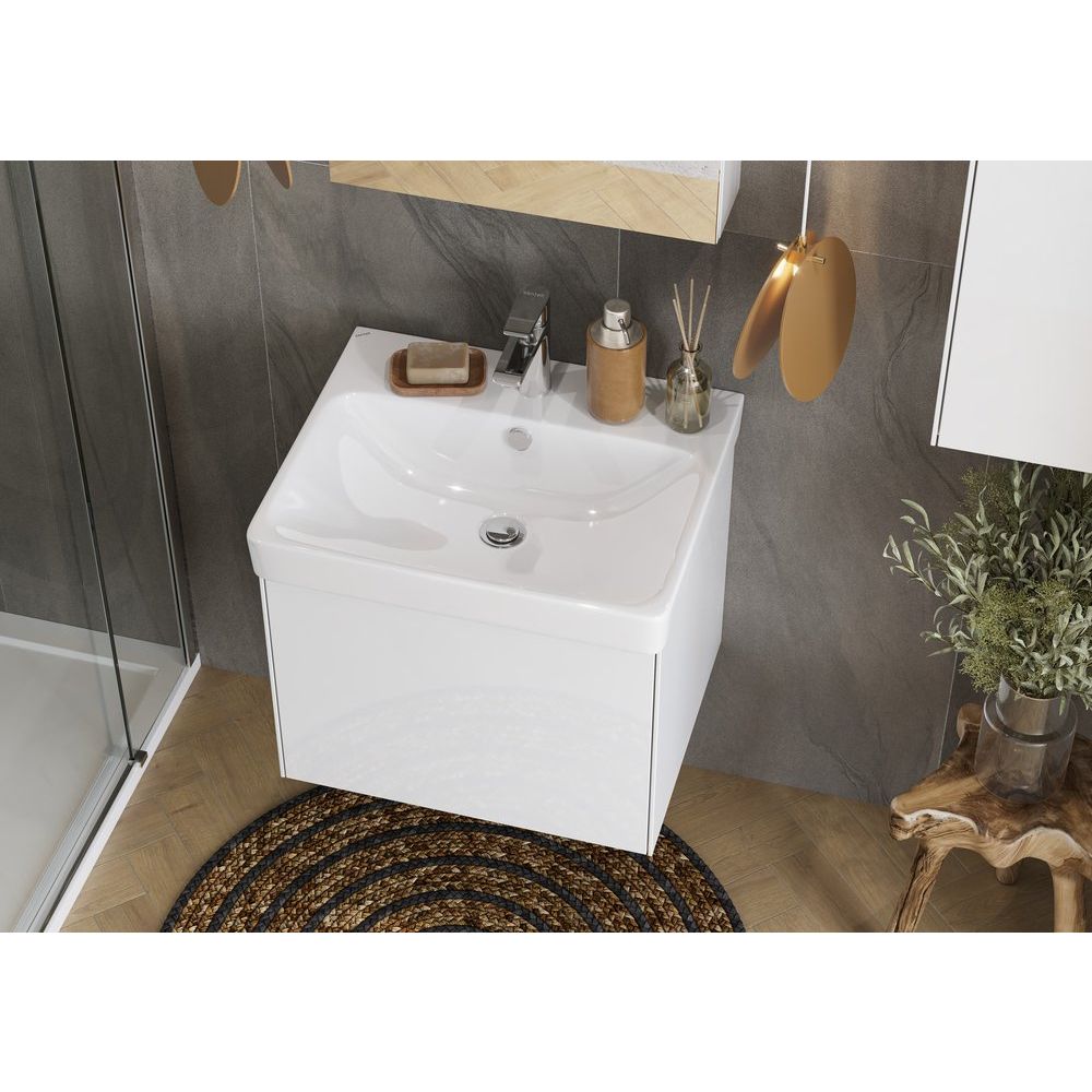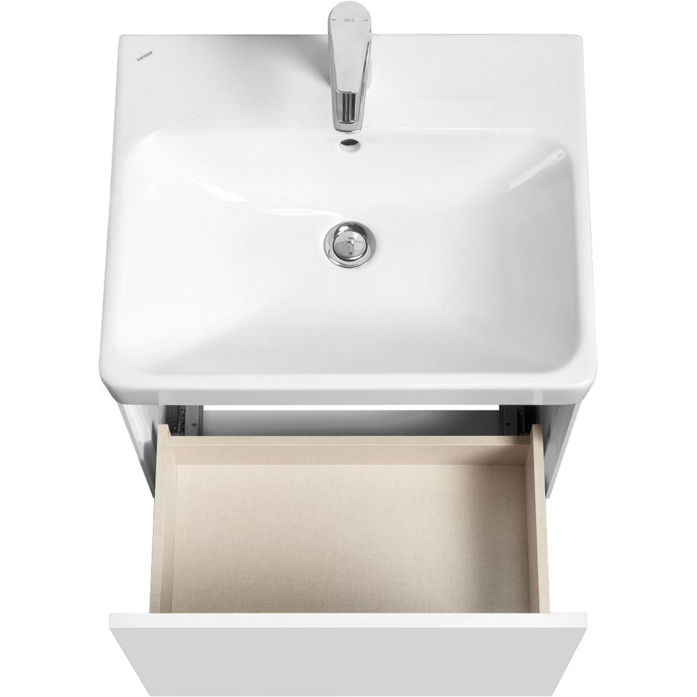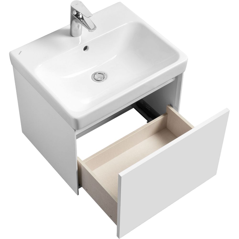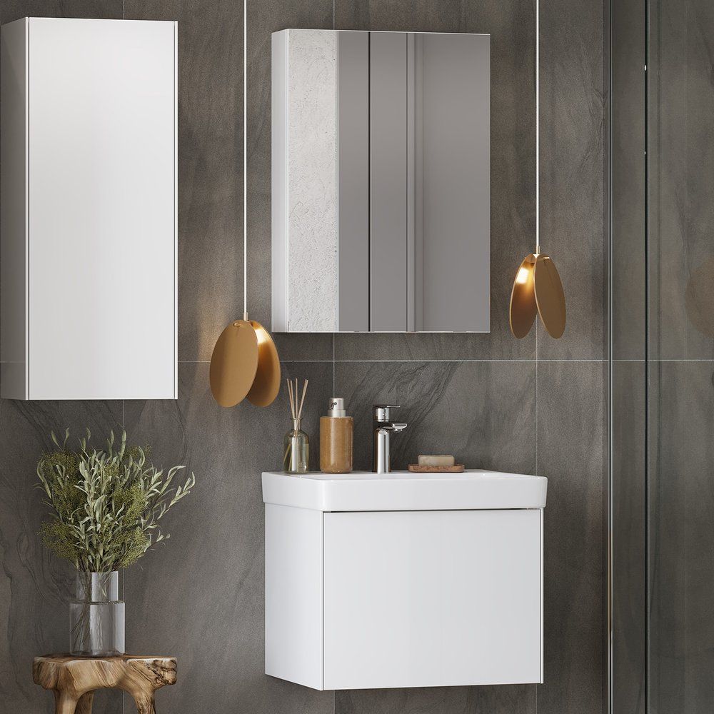 Мебель для ванной AQUATON Асти 55 белая включает в себя тумбу, зеркальный шкаф и раковину, каждый элемент комплекта продуман до мелочей. Подвесная тумба размером 53,2x42,7x40 см изготовлена из ЛДСП с акриловым покрытием и оснащена механизмом доводчика и нажимными механизмами для удобного открывания ящиков. Зеркало-шкаф размером 50x13x70 см выполнено из аналогичного материала и также включает механизм доводчика для плавного закрывания. Мебельная раковина AQUATON Сканди Адриана 55 сделана из фарфора, имеет готовое отверстие под смеситель и включает встроенный слив-перелив. Обратите внимание, что донный клапан необходимо приобрести отдельно.