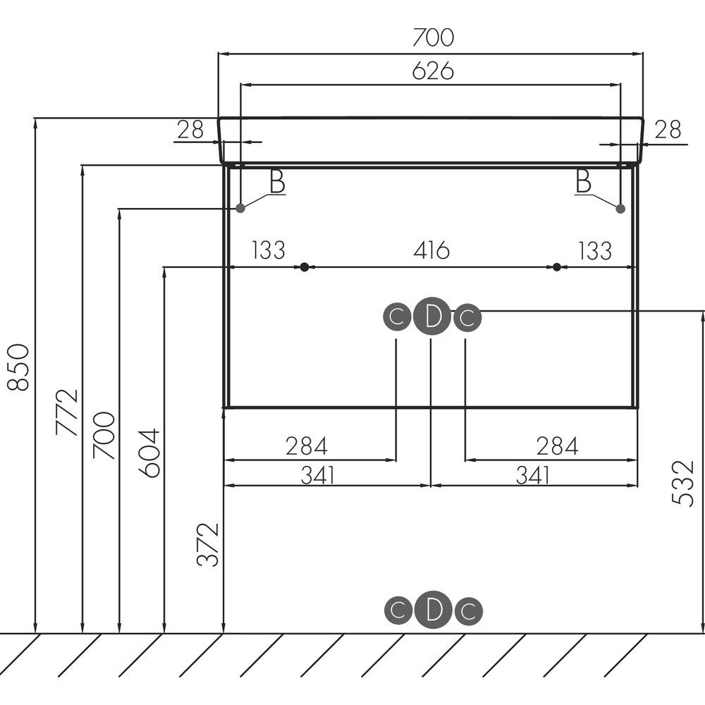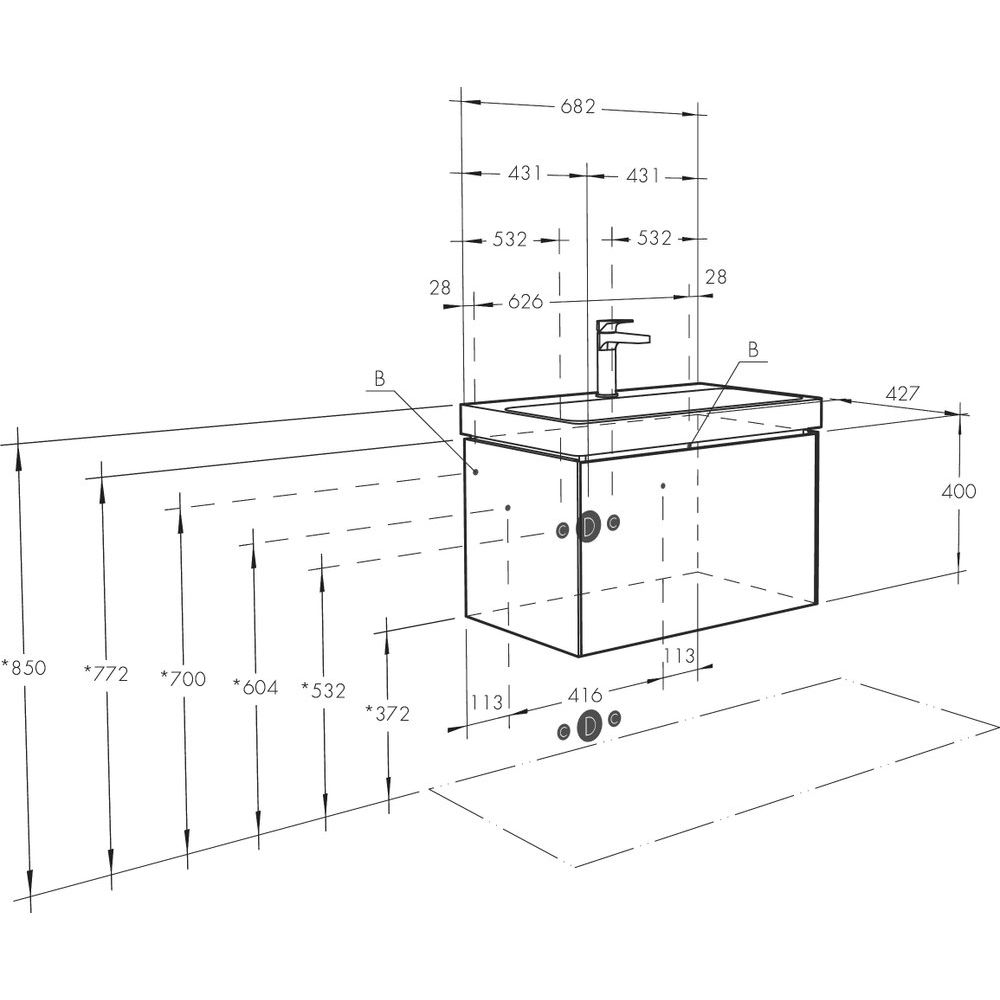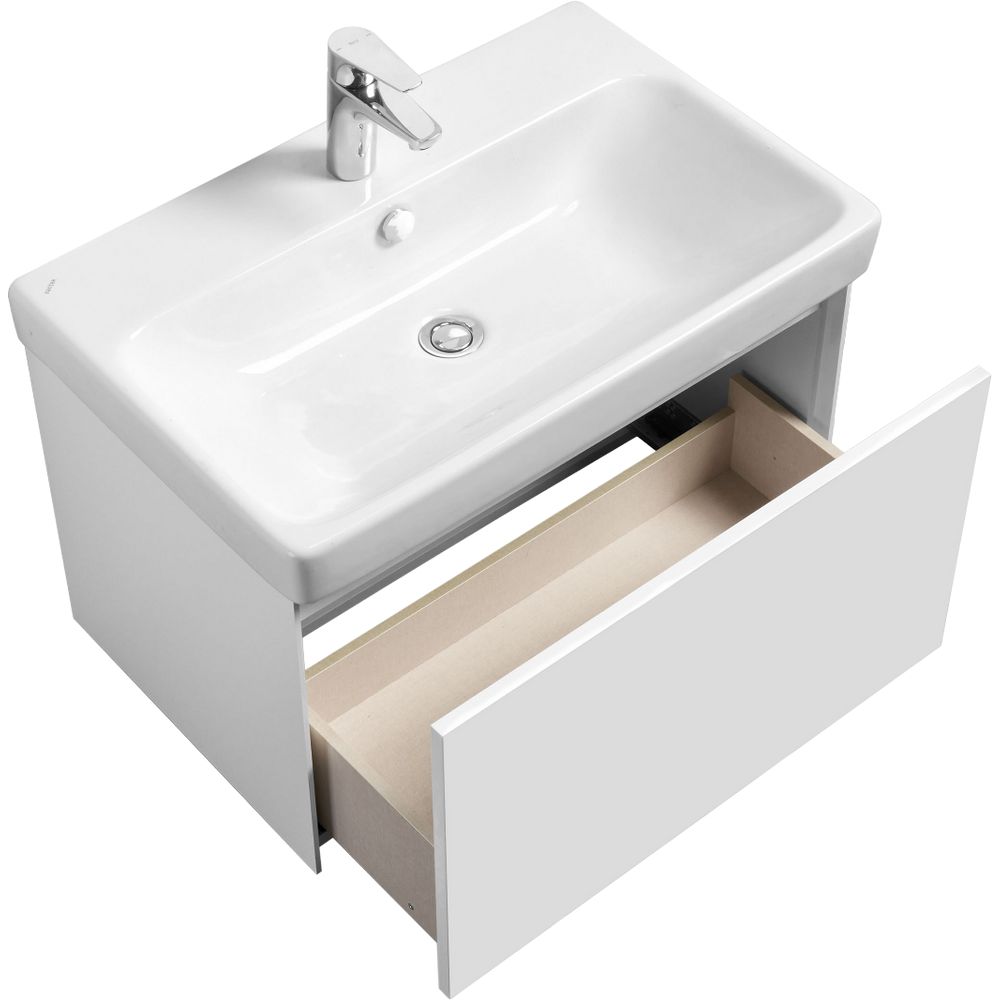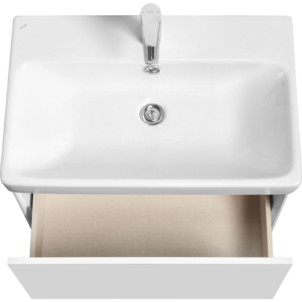 Тумба для комплекта имеет удобные габариты 68,2x42,7x40 см и подвесную конструкцию, что позволяет рационально использовать пространство и легко проводить уборку. Она выполнена из ЛДСП и имеет акриловое и ламинатное покрытие для повышенной износостойкости. Оборудована механизмом доводчика и нажимным механизмом открывания ящиков.