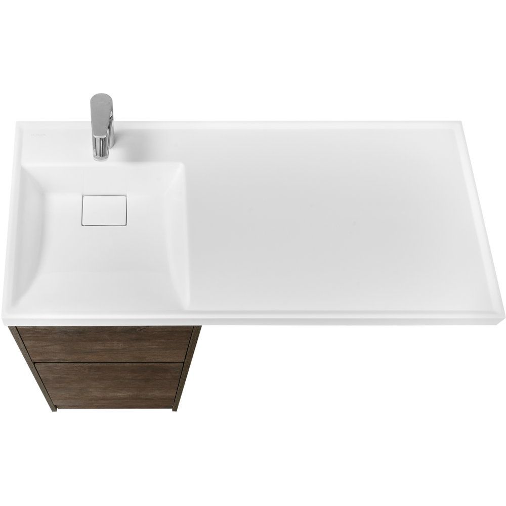 В комплект входят: тумба AQUATON Лондри 40 L без фасада и с габаритами 42x49,6x86 см, которая может быть установлена на пол или подвесной; мебельная раковина 105x50 см из искусственного мрамора, с декоративной накладкой на слив и отверстием под смеситель; сменный элемент 38.4x1.6x72.4 см из ЛДСП; зеркало-шкаф 100x13x75 см, обеспечивающий дополнительное место для хранения, с доводчиком для плавного закрывания. Все элементы произведены в России.