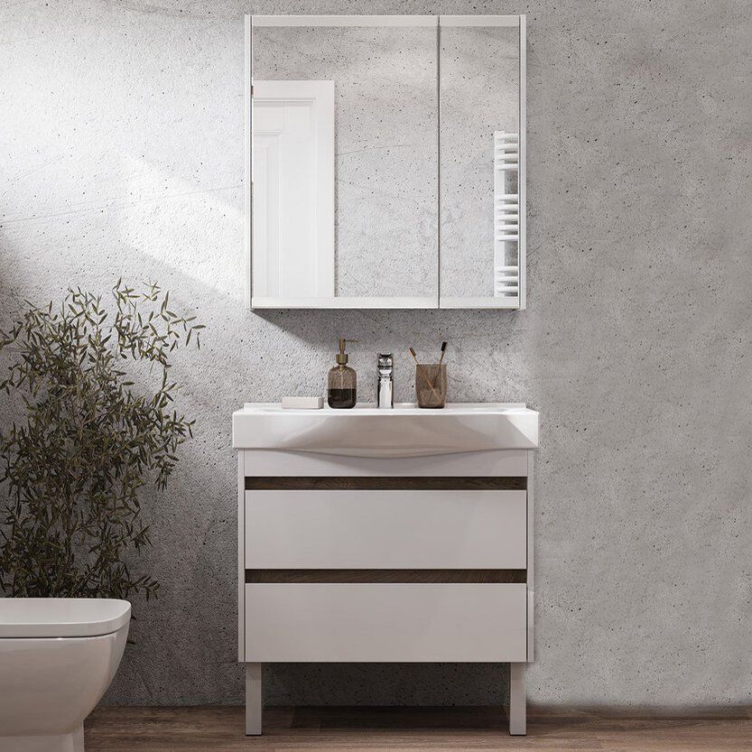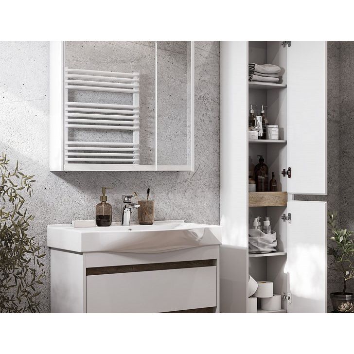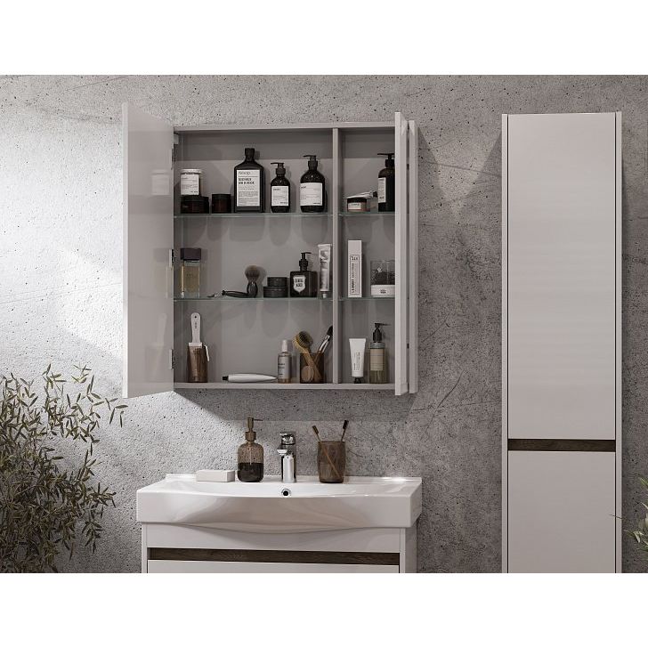 Зеркало-шкаф: Размеры 80x13x81 см, выполнено из ДСП, эмалевое покрытие. Оснащено механизмом доводчика и подвесами. Без встроенной подсветки, гарантия 3 года.