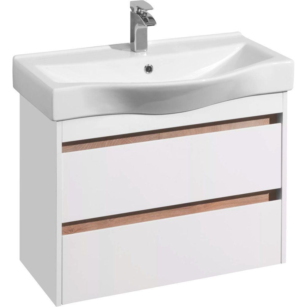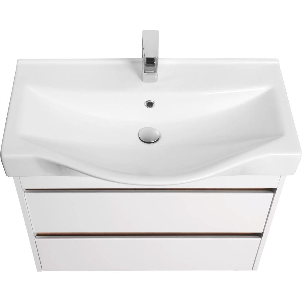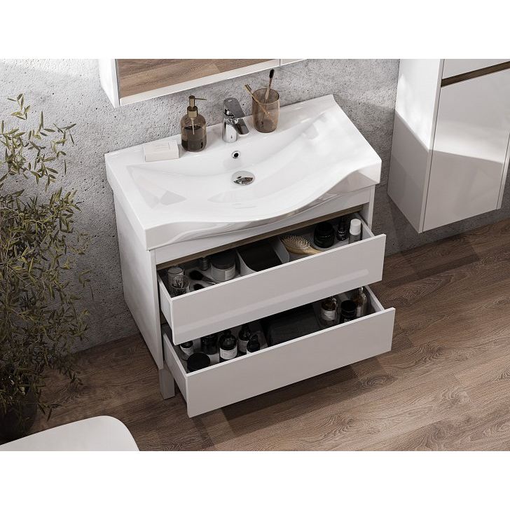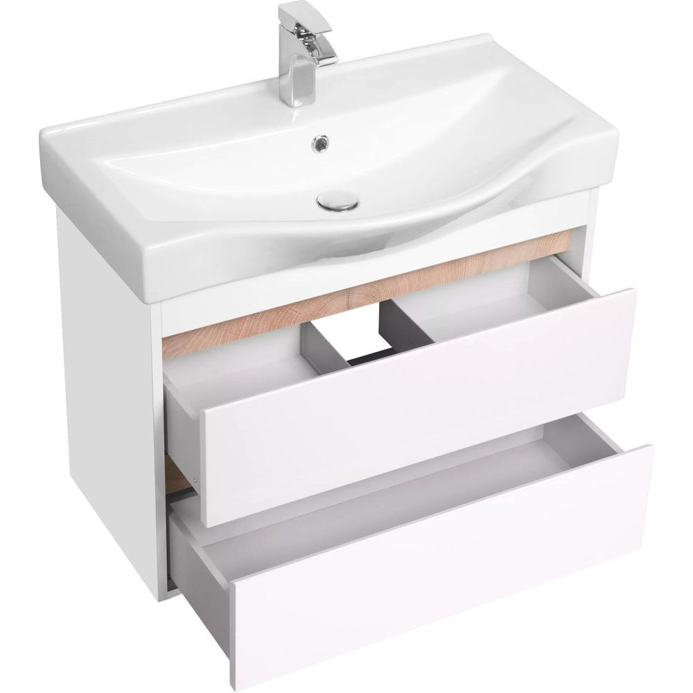 Тумба: Габариты 76x35,7x55,4 см, подвесная конструкция с механизмом доводчика. Изготовлена из ДСП с эмалевым покрытием для защиты от влаги. Фасад — из МДФ, имеет выдвижные ящики, гарантия 3 года.