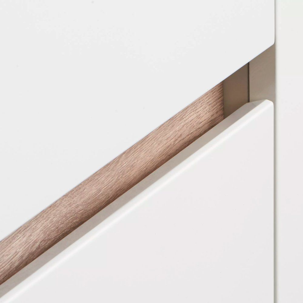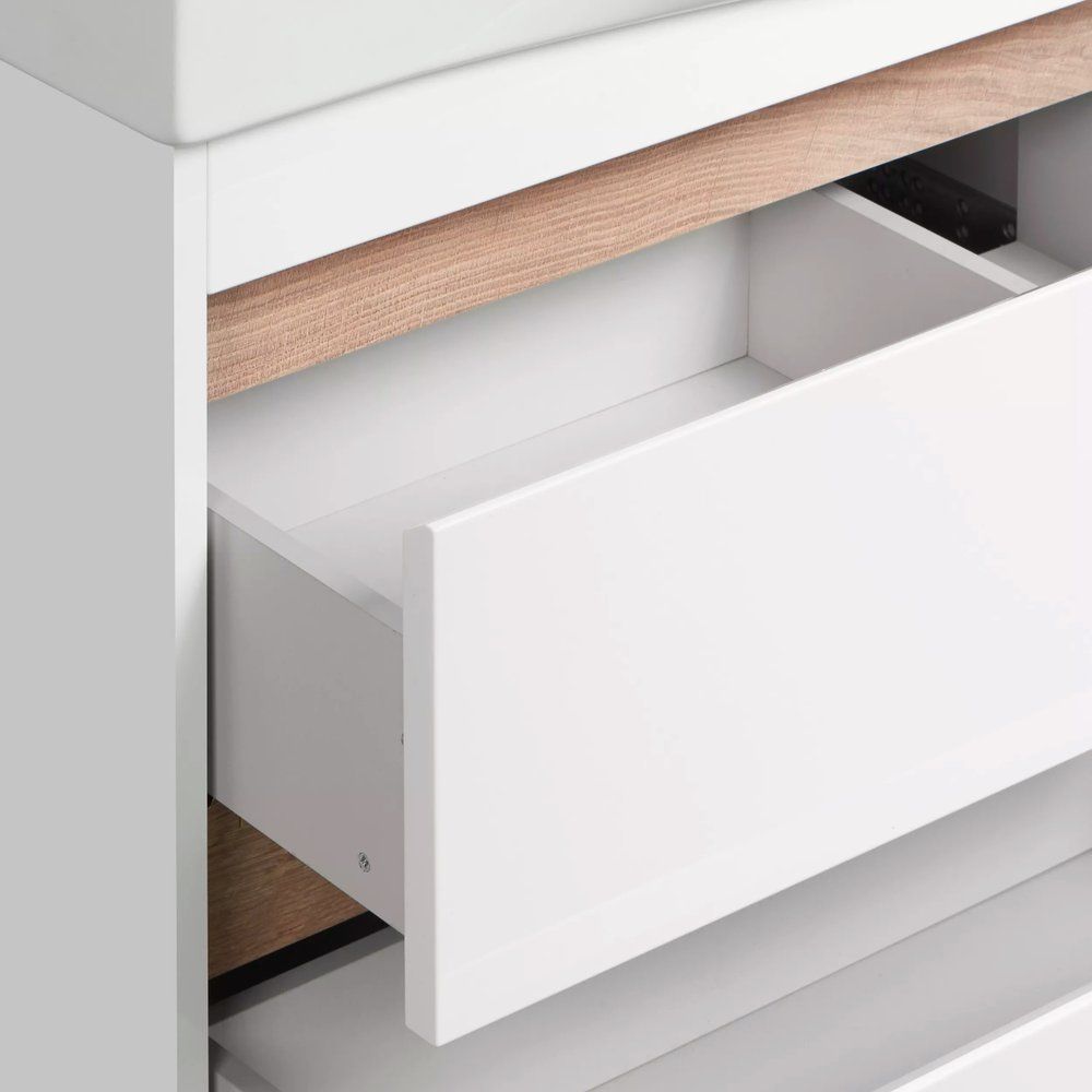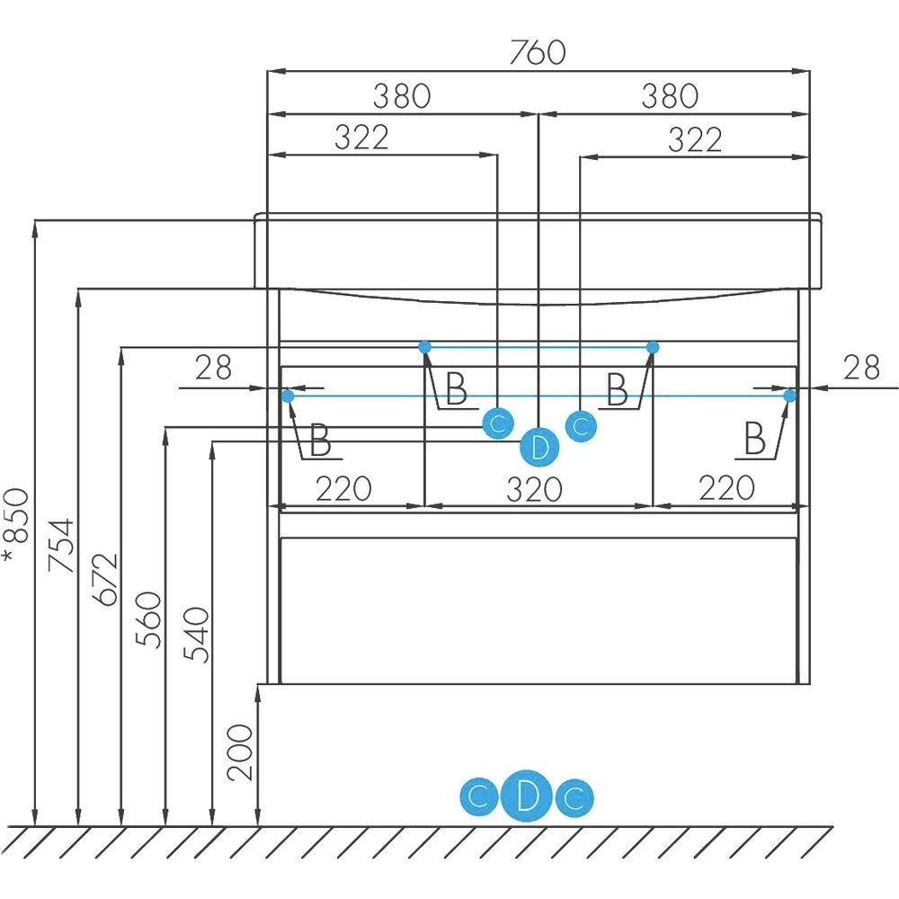 Тумба: Габариты 76x35,7x55,4 см, подвесная конструкция с механизмом доводчика. Изготовлена из ДСП с эмалевым покрытием для защиты от влаги. Фасад — из МДФ, имеет выдвижные ящики, гарантия 3 года.