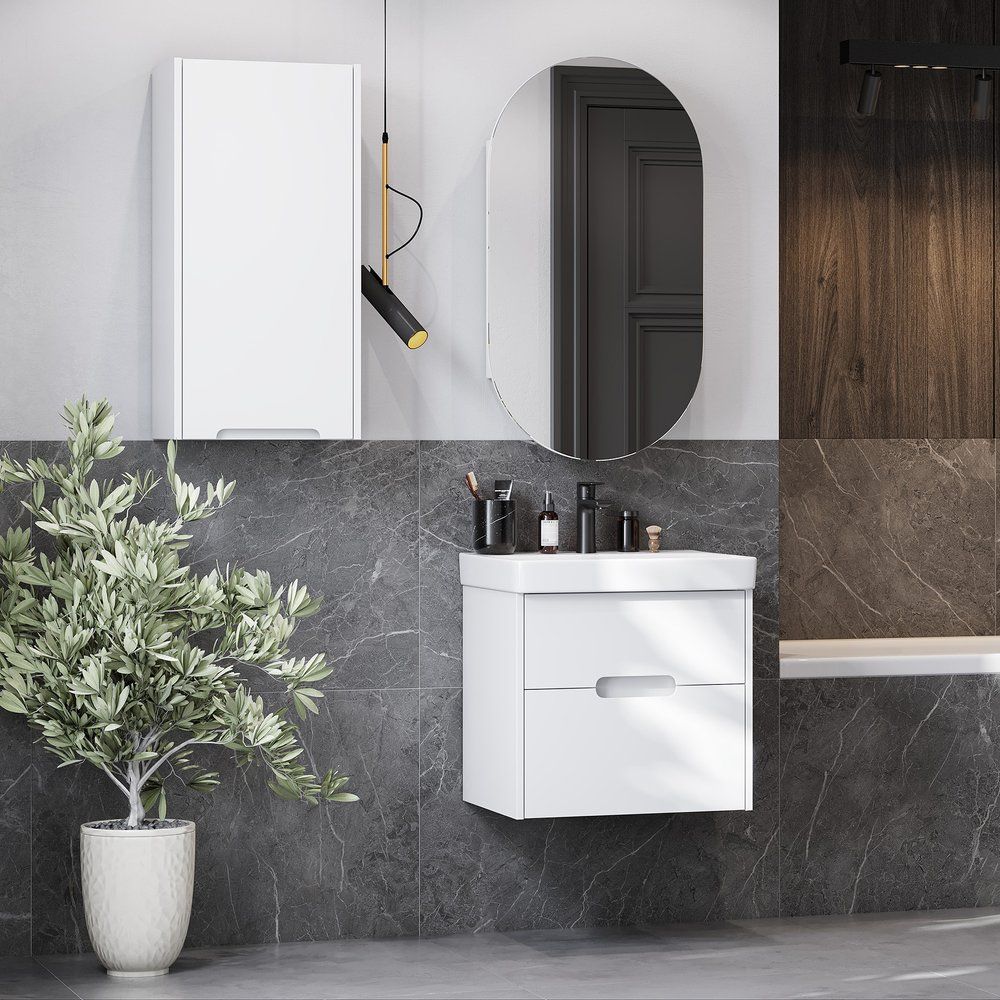 Тумба AQUATON Оливия 55 обладает размерами 53,2x42,7x48 см, и её подвесная конструкция обеспечивает лёгкость монтажа, исключая необходимость в сложных технических работах. Изготовлена из ЛДСП с ламинатным покрытием, что предотвращает проникновение влаги. Фасады выполнены из МДФ, покрытого пленкой, что придаёт эстетичную гладкость и защиту от агрессивных сред. Встроенный механизм доводчика гарантирует долгий срок службы без поломок. Мебельная раковина AQUATON Сканди Адриана 55 изготовлена из высококачественного фарфора и включает встроенный слив-перелив. Размеры раковины составляют 55x45 см, она оснащена отверстием под смеситель и рассчитана на сифон диаметром 3,2 см, который приобретается отдельно. Зеркало-шкаф AQUATON Оливия 50 с размерами 50x13,1x90 см выполнено из ЛДСП с покрытием из эмали и ламината, гарантируя устойчивость к воздействию влаги.