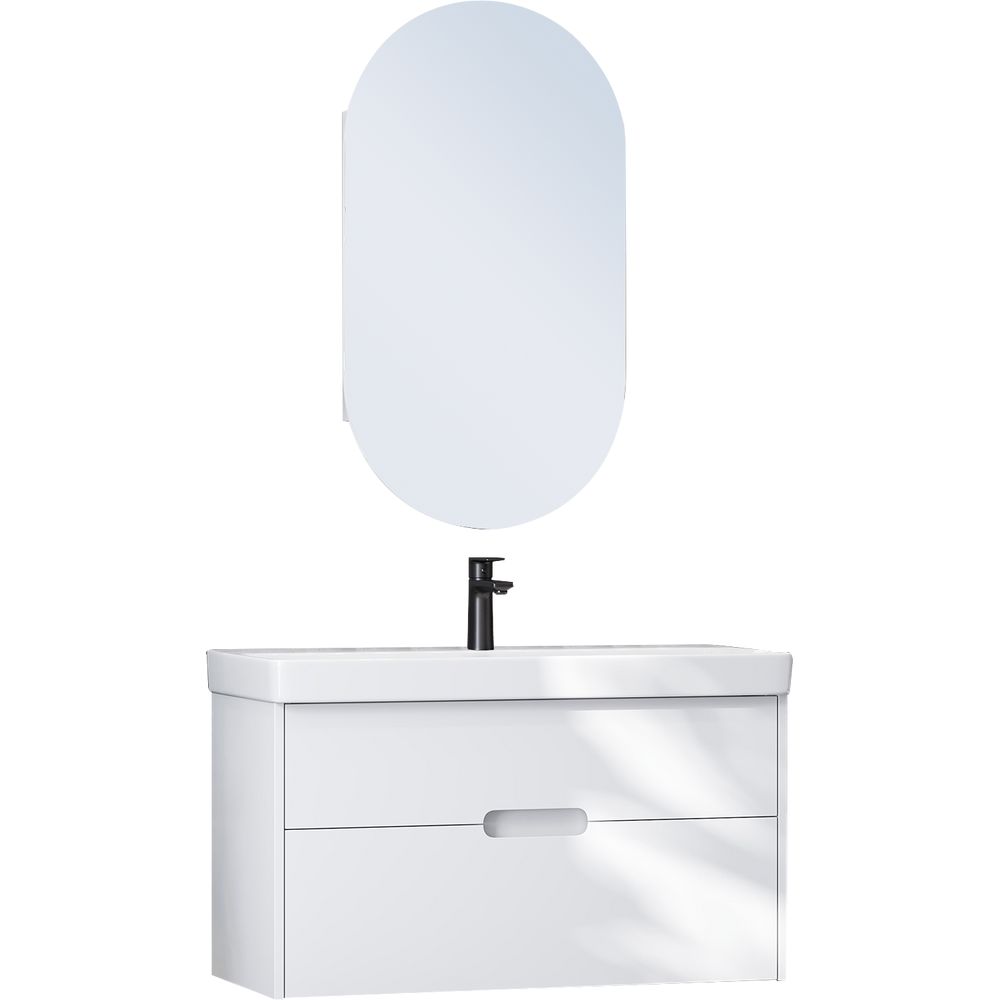 - Комплект включает всё необходимое: тумбу, мебельную раковину и зеркало-шкаф.