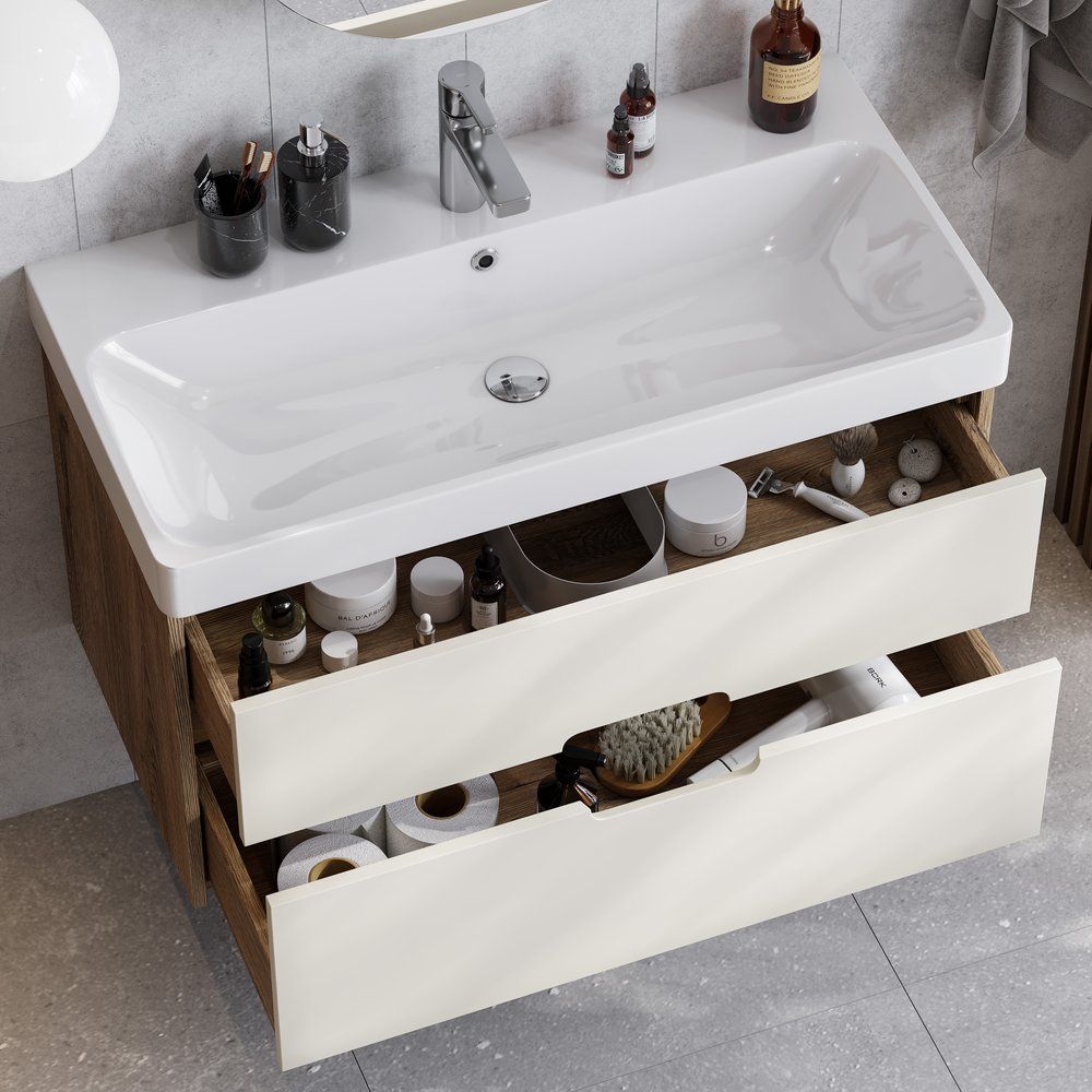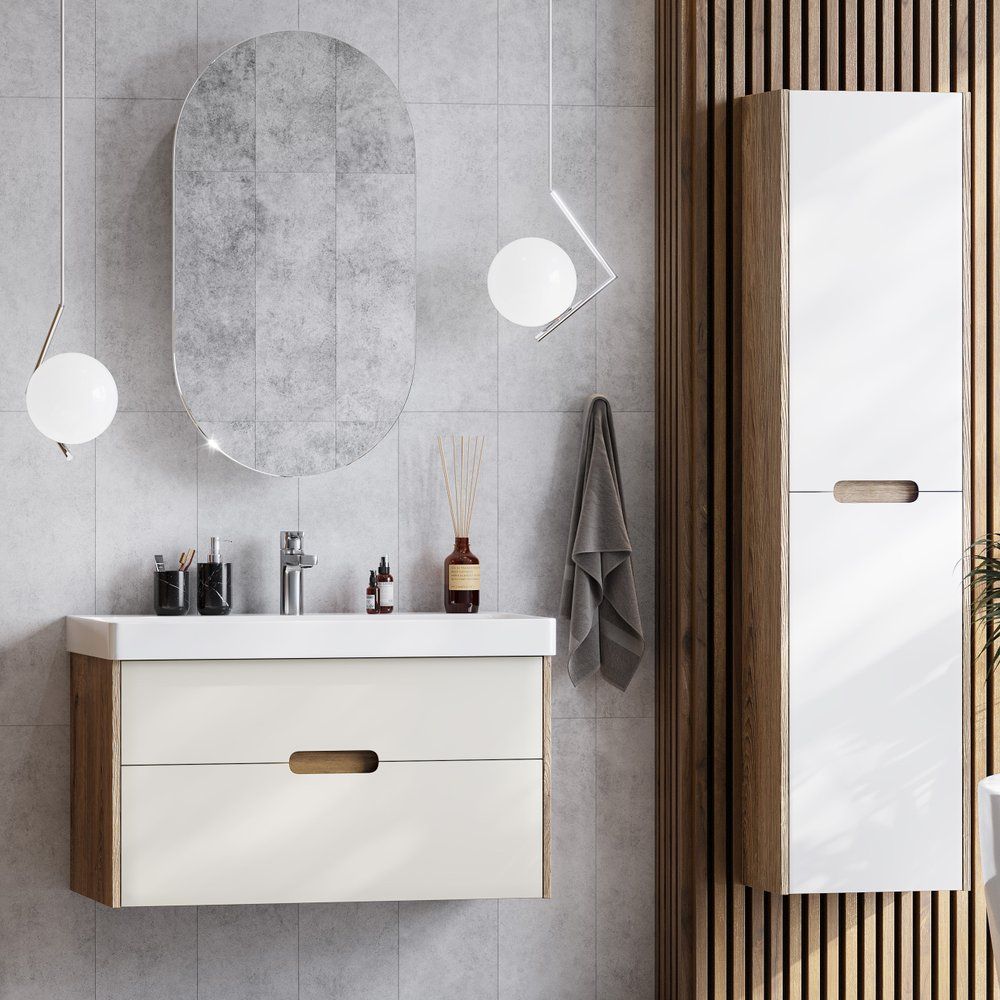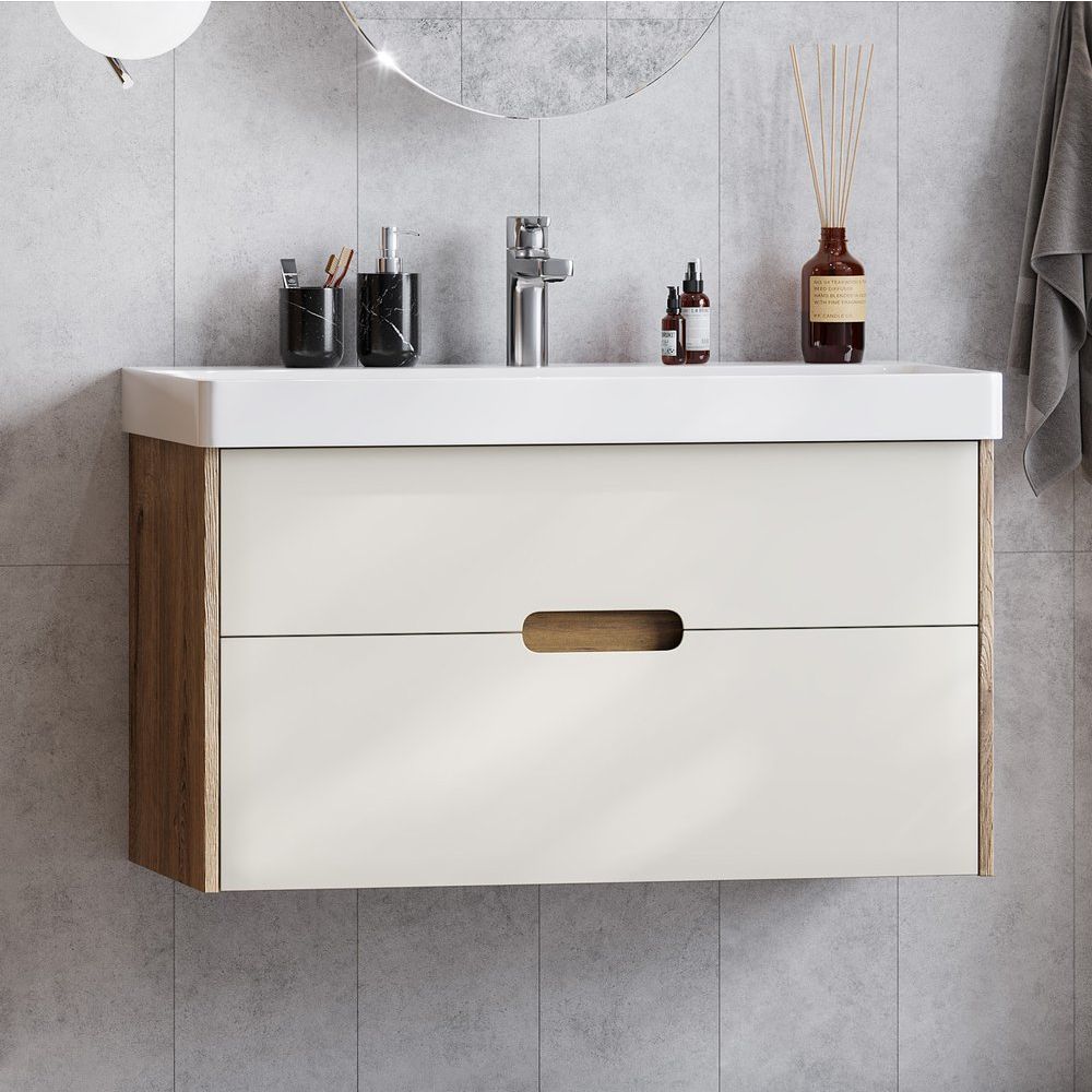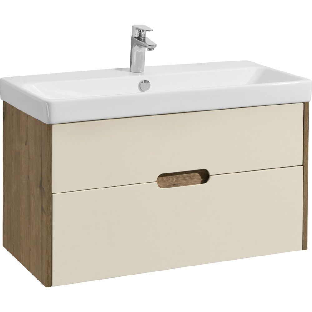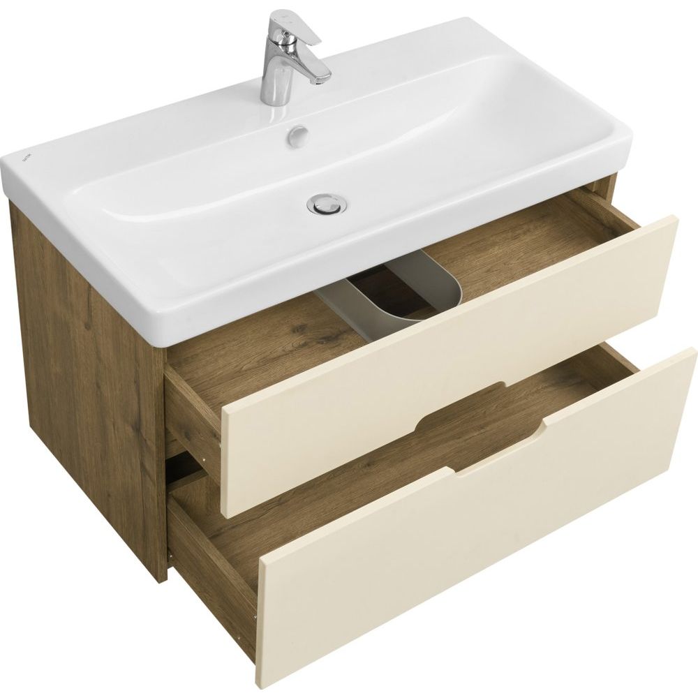 Создание комфортного и стильного интерьера ванной комнаты начинается с выбора правильной мебели. Комплект мебели для ванной комнаты AQUATON Оливия 90 в сочетании бежевого и дуба велл предложит вам не только эстетичный дизайн, но и высокое качество материалов. Он идеально вписывается в современные интерьеры, добавляя теплый акцент и внося нотки элегантности. Гарнитур объединяет в себе функциональность и практичность, позволяя с удобством хранить все необходимые принадлежности в ванной комнате.