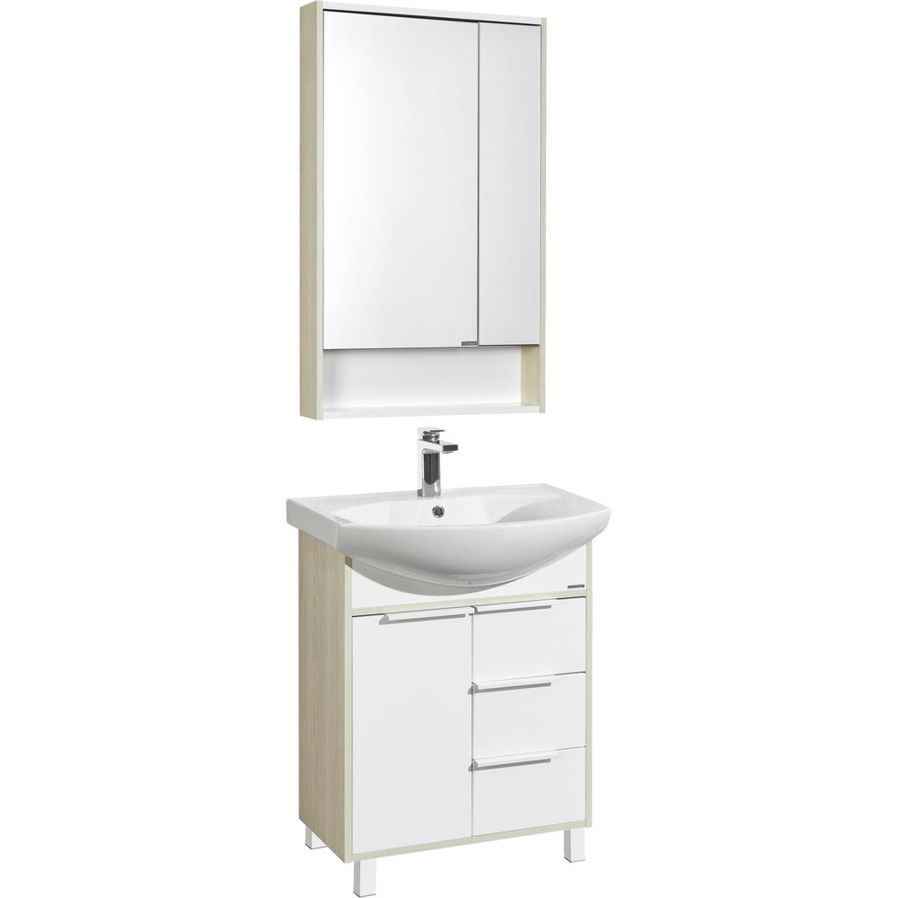 Тумба для комплекта AQUATON Рико 65 имеет габариты 59,4x72x85 см, выполнена из ДСП и оформлена пленкой и ламинатом. Ее напольное исполнение и белая фурнитура добавляют эстетики. Фасад из МДФ покрыт эмалью, а встроенный механизм доводчика обеспечивает комфорт в эксплуатации. Мебельная раковина AQUATON Смайл 65 из фаянса, размером 65x44,5 см, предусматривает дополнительную покупку донного клапана и оснащена сливом-переливом с отверстием под смеситель. Зеркало-шкаф размером 65x13,5x86 см с продуманным механизмом подвески, выполнено с покрытием ламинат и лишено встроенной подсветки.