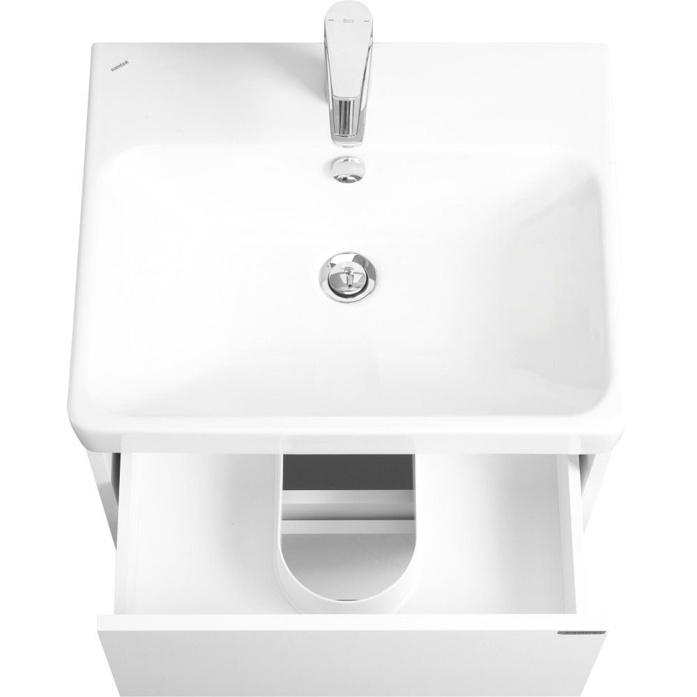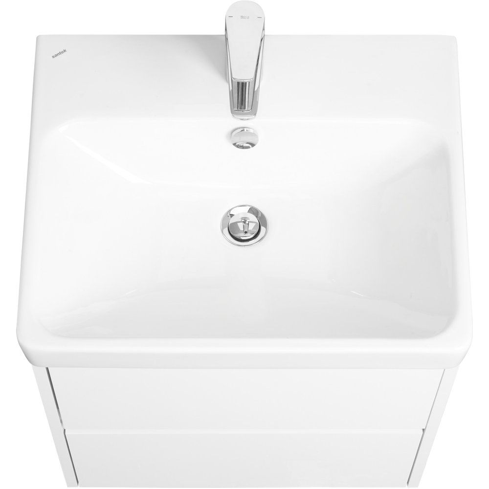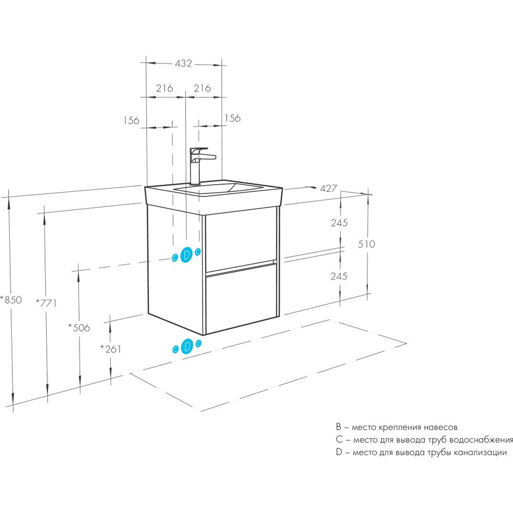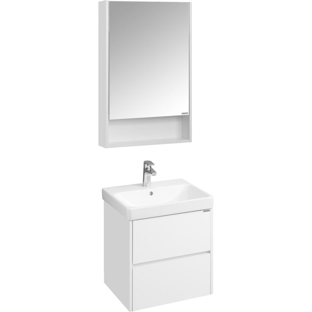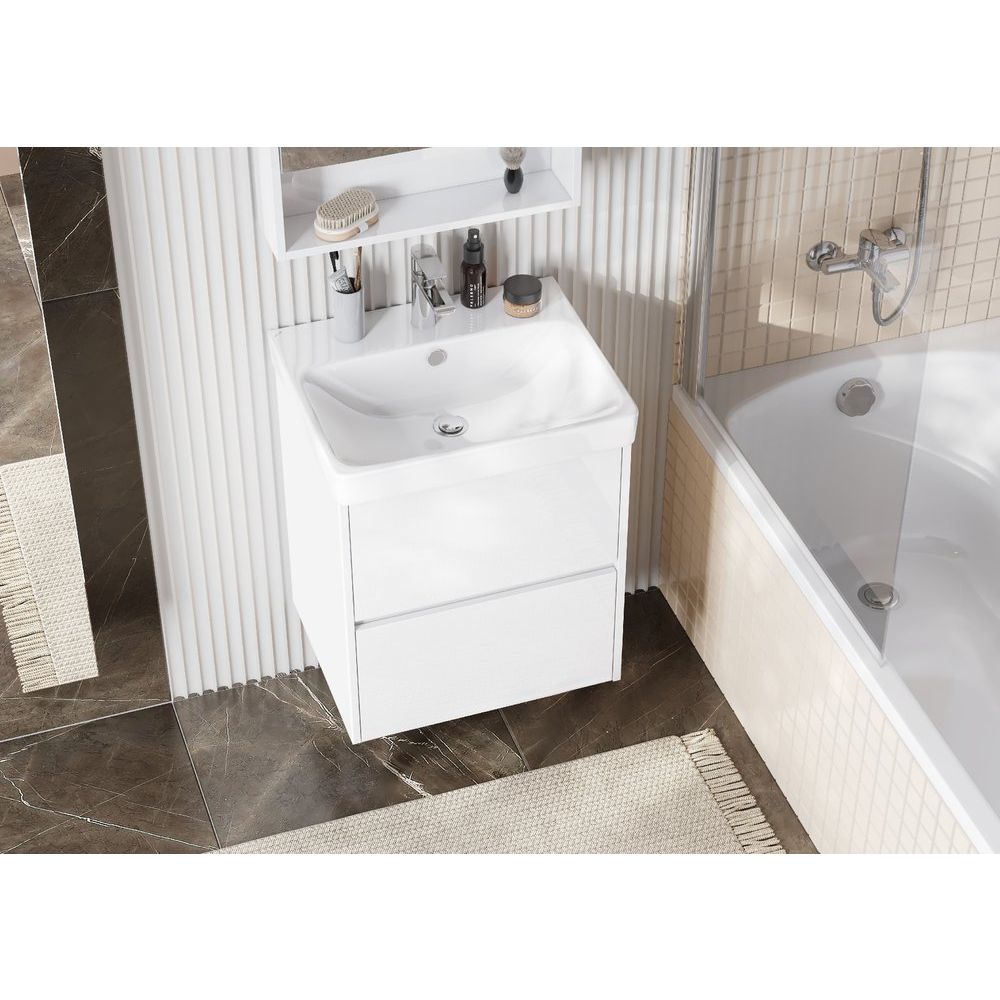 Комплект мебели включает в себя тумбу размером 43,2x42,7x51 см, которая благодаря своей подвесной конструкции обеспечивает легкость уборки. Тумба оснащена направляющими скрытого монтажа push-to-open и мягко закрывающимися ящиками. Зеркало-шкаф размерами 45x13x85 см выполнено из того же материала и также подвесное, что придает единство всему ансамблю. Раковина "Адриана 45" выполнена из фарфора и имеет встроенный слив-перелив, а также готовое отверстие под смеситель. Комплектование продумано до мелочей, включая слив-перелив, но стоит помнить, что донный клапан необходимо приобрести отдельно.
