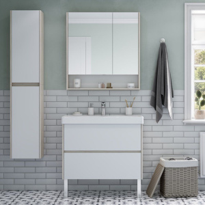 Фарфоровая мебельная раковина размером 90x45 см оснащена встроенным сливом-переливом и одним отверстием для смесителя, а зеркало-шкаф дополняет комплект своим лаконичным дизайном и вместительностью. Оно также обладает механизмом доводчика для плавного закрывания и подвесными креплениями. Его размеры составляют 85x13x85 см.