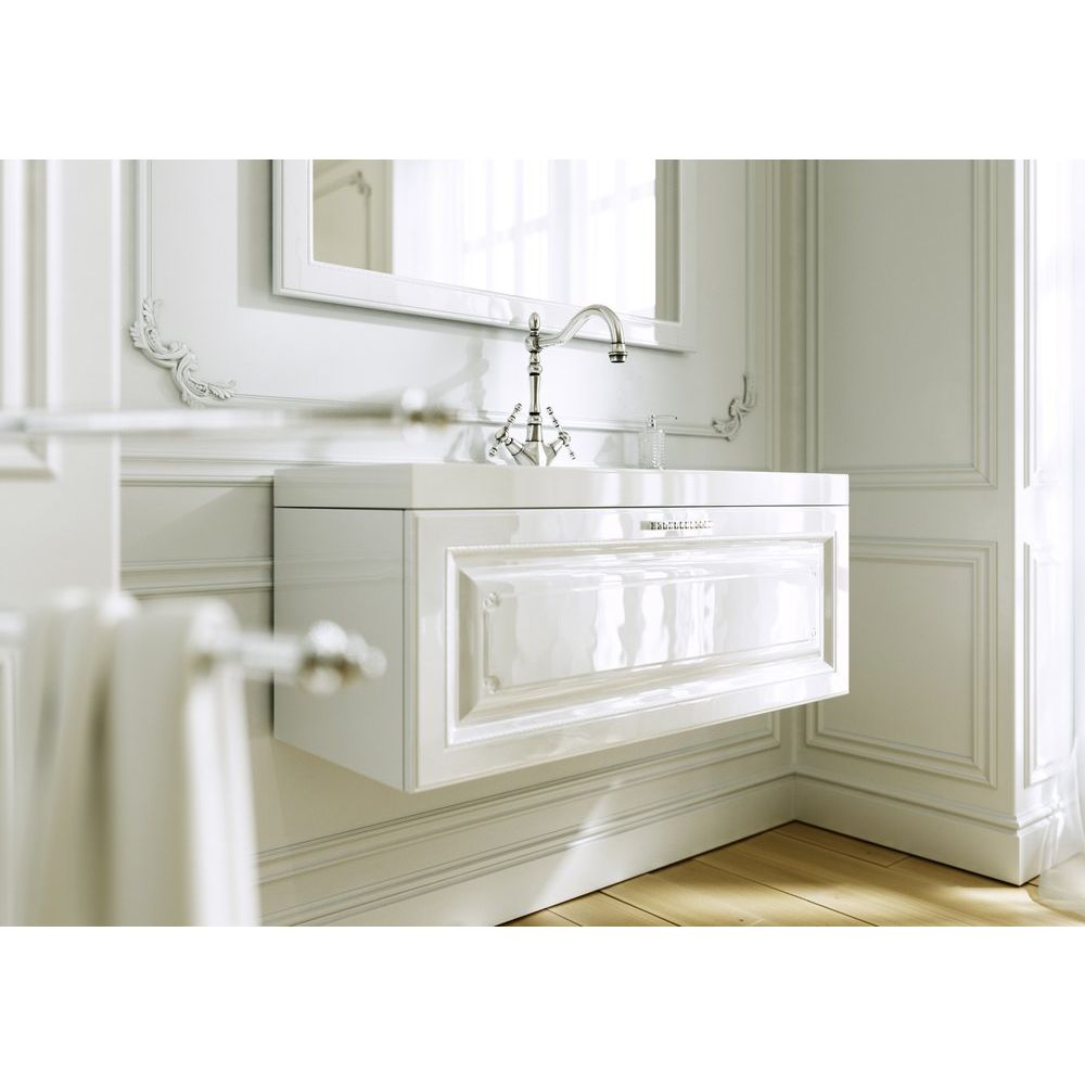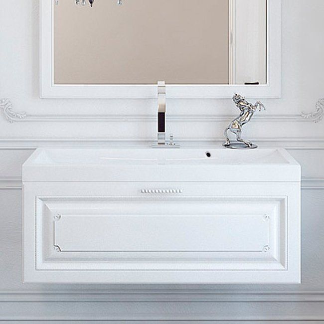 Тумба для комплекта: Подвесная конструкция размером 100x39,8x42,5 см из МДФ с белой глянцевой эмалью. Ящик оборудован механизмом доводчика для плавного закрывания, хромированная фурнитура дополняет образ. Изготовлено в России с гарантией 2 года.