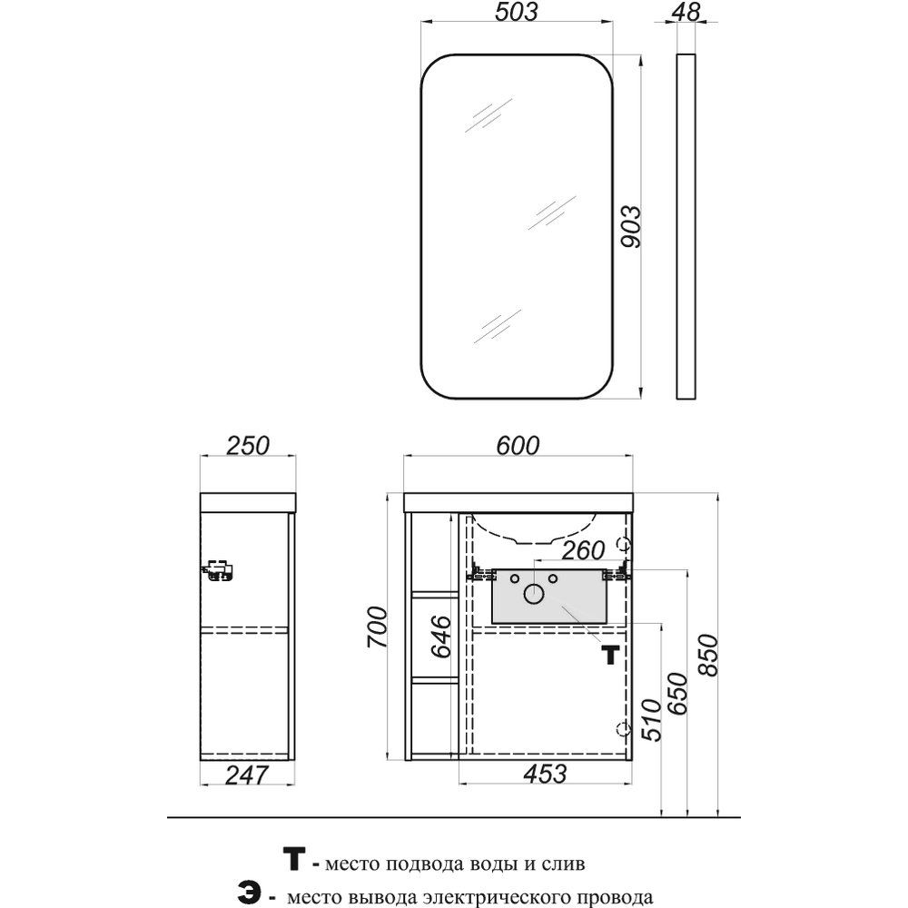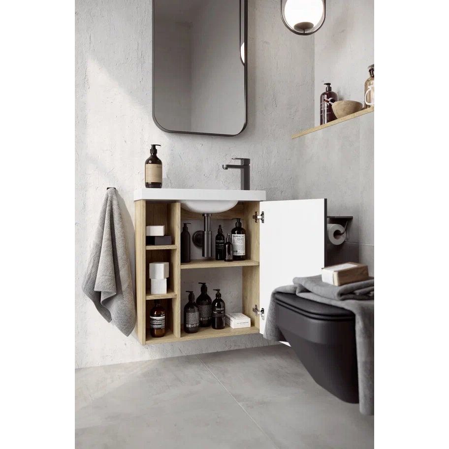 Комплект включает подвесную тумбу Aqwella Alba 60 R размером 59,4x24,7x64,6 см, выполненную из прочной ЛДСП с ламинированным покрытием корпуса и эмалированным фасадом. Тумба оборудована дверками и открытыми полками с доводчиками, улучшая комфорт использования.