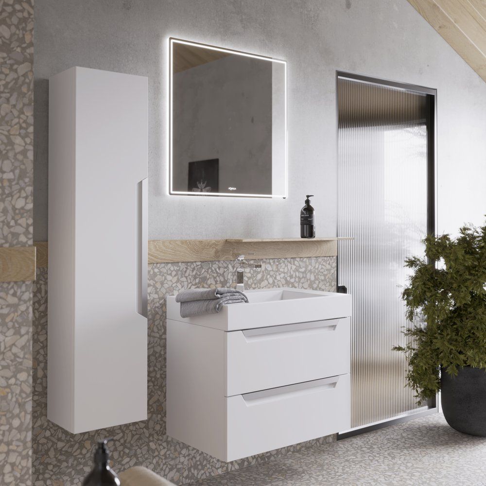 Мебель для ванной комнаты Aqwella Cube 70 в белом матовом исполнении – это стильное и функциональное решение для вашего интерьера. Мебельный гарнитур включает в себя подвесную тумбу с механизмом доводчика, который обеспечивает плавное закрывание ящиков, раковину из искусственного мрамора и элегантное зеркало с сенсорной регулировкой подсветки. Внимательная проработка каждой детали и качественные материалы гарантируют долгий срок службы и превосходный внешний вид.