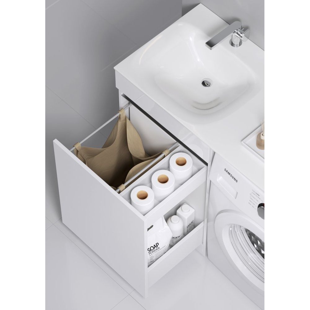 - Практичная тумба с бельевой корзиной слева и отделениями для хранения.