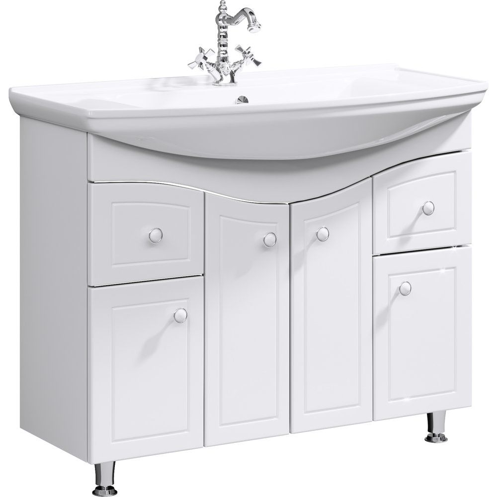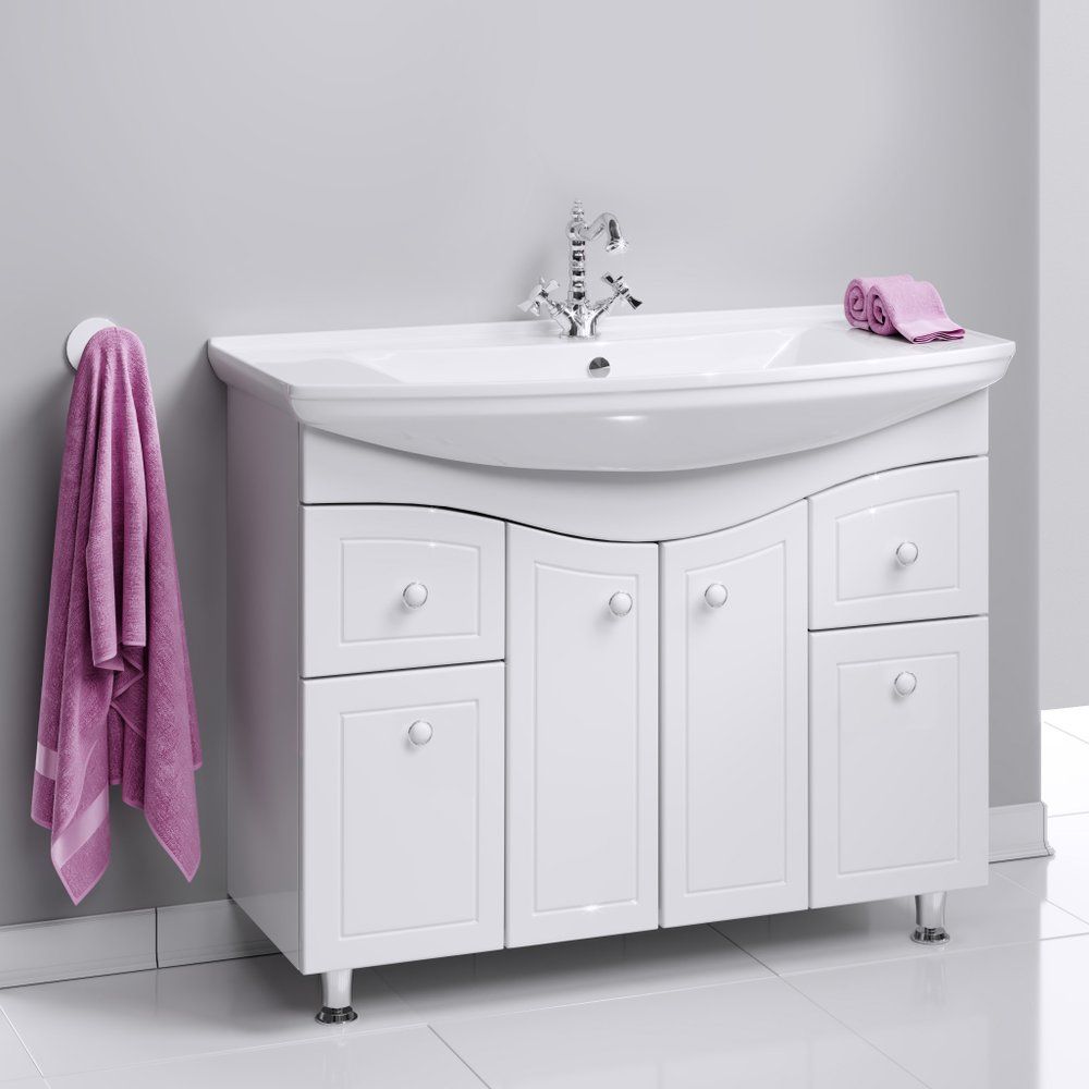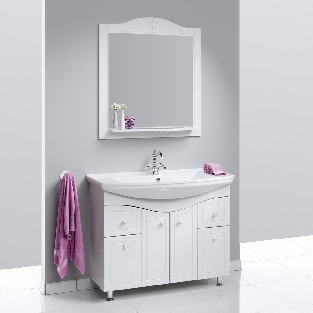 Набор мебели для ванной комнаты Aqwella Franchesca 105 – это идеальное решение для создания стиля и практичности в вашей ванной комнате. Этот напольный гарнитур, выполненный в белоснежном цвете и оформленный в классическом ретро-стиле, придаст вашему пространству неповторимый шарм и лёгкость. Применение высококачественной глянцевой эмали обеспечивает надёжную защиту от влаги, что важно для условий ванной комнаты. Эргономика комплекта разработана с заботой о деталях: ящики оснащены направляющими Blum, обеспечивающими плавное и бесшумное закрывание, а внутри фасадов вы найдете удобные полки. Влагостойкое прямоугольное зеркало с дополнительно установленной полкой станет идеальным местом для хранения косметических и уходовых средств.