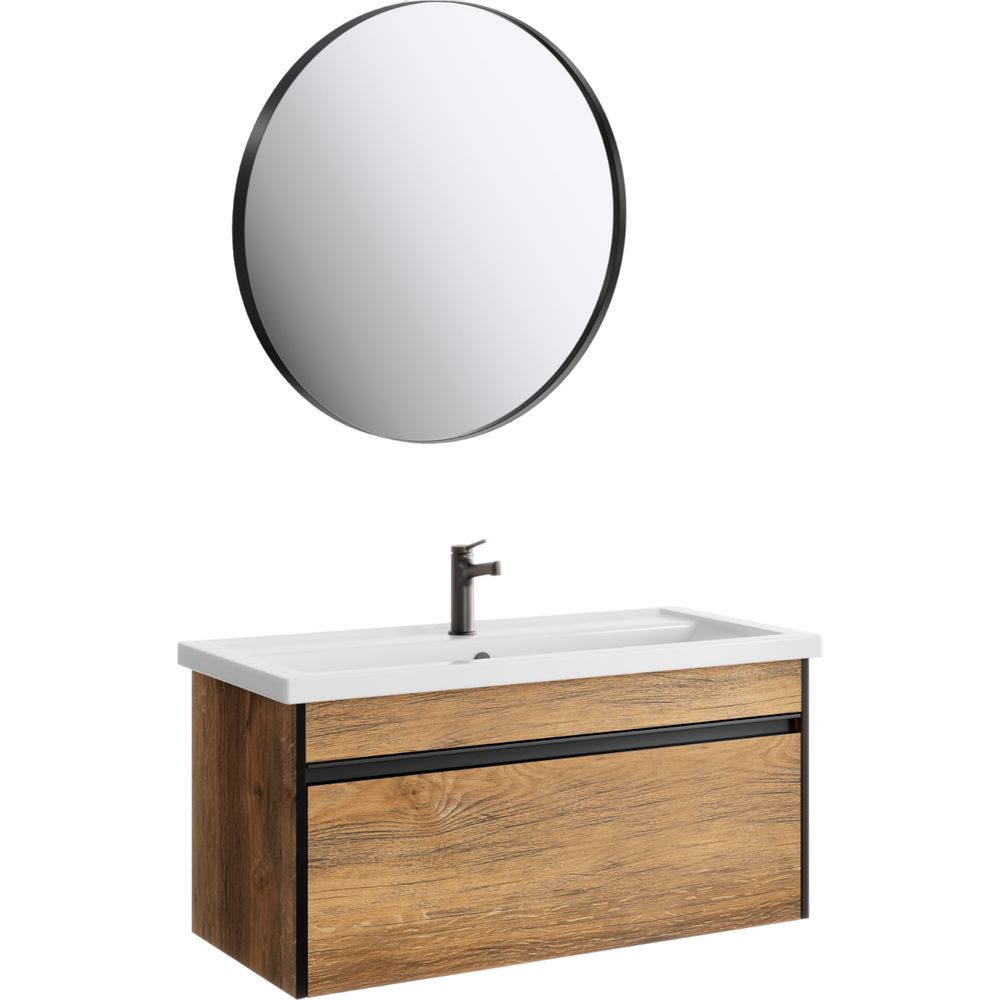 Мебель для ванной Aqwella Urban 100 в изысканном дизайне "дуб балтийский" — это гармоничное сочетание современного стиля и высококачественных материалов. Подвесная тумба и вместительные ящики с доводчиком упрощают хранение необходимых вещей и делают процесс использования более комфортным. К комплекту прилагается фаянсовая раковина и стильное круглое зеркало с черной стальной рамой, гармонично завершающее образ вашей ванной комнаты.
