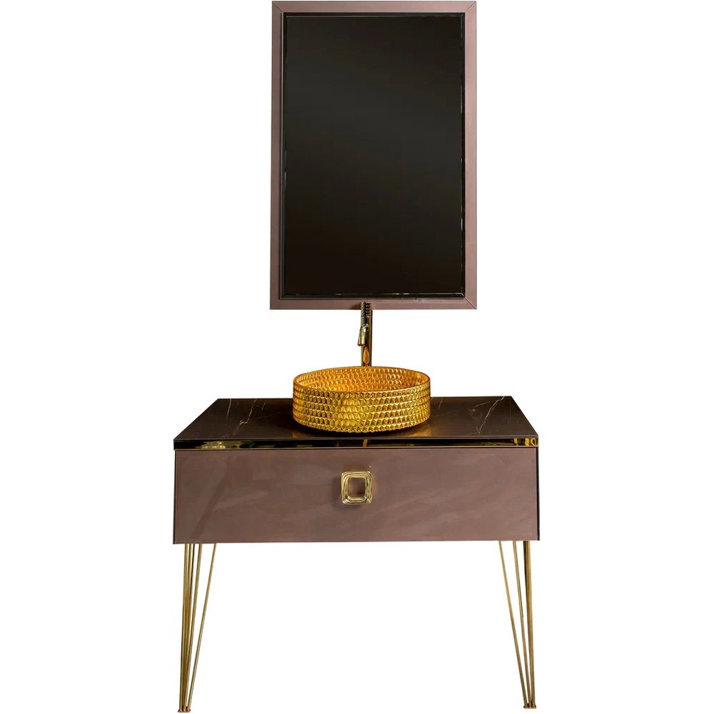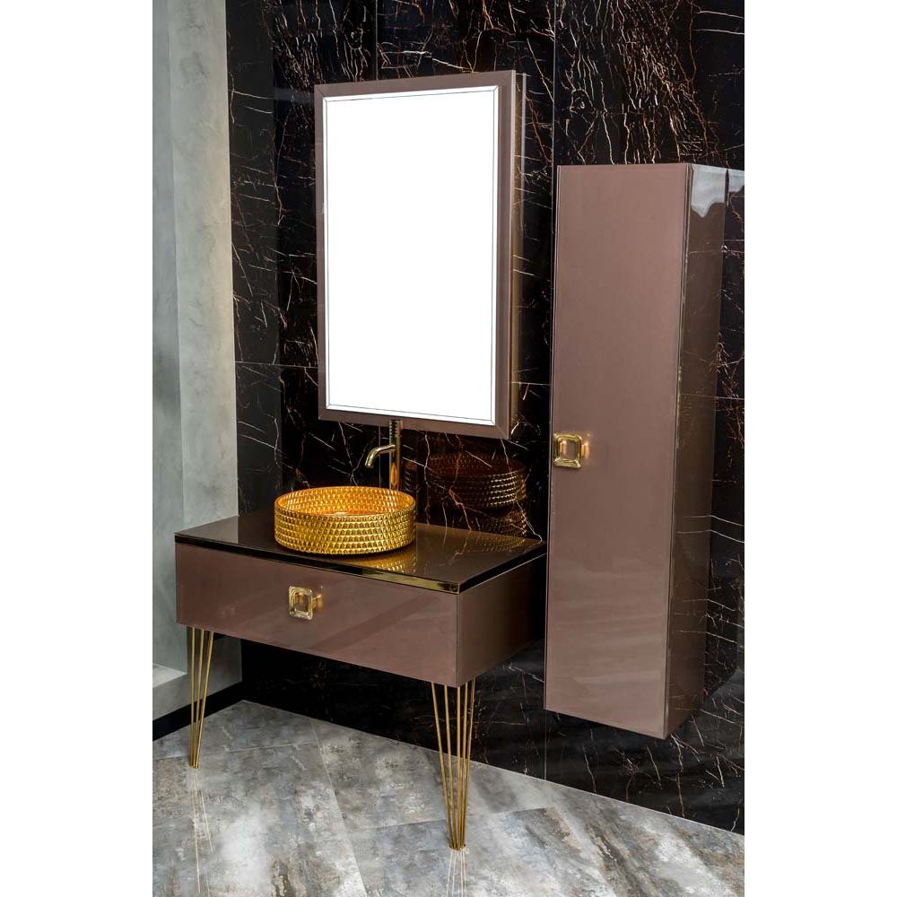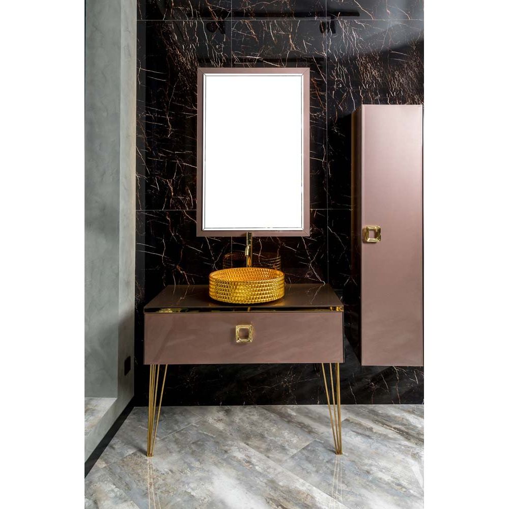 Тумба Armadi Art Lucido 100 выполнена из МДФ и стекла, покрыта стойкой городской эмалью и оснащена акриловыми фасадами с доводчиками для плавного закрывания. Столешница шириной 101 см из розового стекла, оснащена отверстием под смеситель и без намеченных отверстий под него. Ножки и декоративные элементы выполнены из нержавеющей стали с золотым напылением. Зеркало с габаритами 70х105 см дополнено подсветкой за полотном, что придаст атмосферу уюта и стиля. Все элементы покрыты гарантией на срок 1 год.
