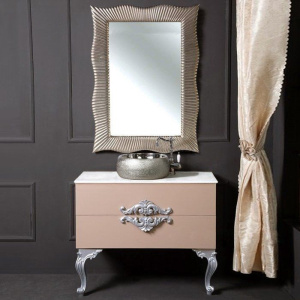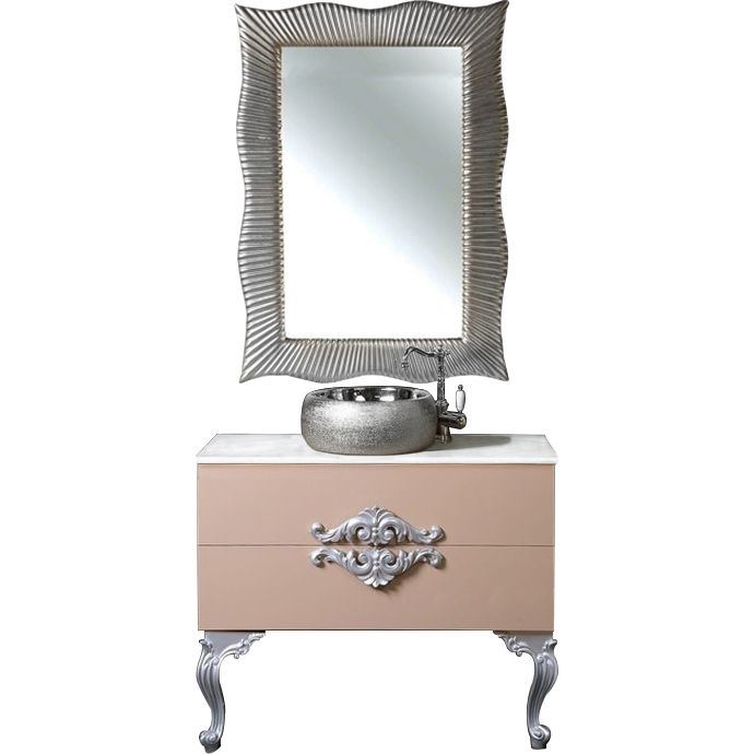 Гарнитур включает в себя тумбу с размерами 100x50x48 см, выполненную из акриловой МДФ с доводчиком для плавного закрывания. Подвесная столешница из белого искусственного камня имеет размеры 101x52x1.8 см и одно отверстие под смеситель. Мебельная раковина, доступная в серебре, имеет размеры 67x45 см и предусмотрена для сифона диаметром 3.2 см. Продается без донного клапана, который нужно приобрести отдельно. Также в комплект входят серебряные ножки высотой 35 см и ручки из полиуретана. Зеркало круглой формы из эмалированного МДФ имеет размеры 82x5x82 см.