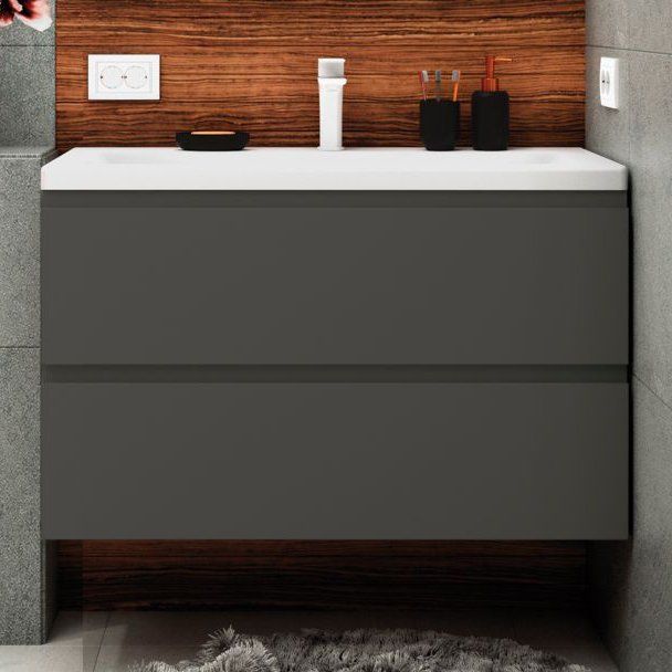 Тумба для комплекта имеет габариты 90x45x55 см и выполнена из МДФ, покрытие – серый матовый эмаль. Оборудована ящиками с механизмами доводчика. Мебельная раковина из искусственного мрамора идёт с декоративной накладкой на слив и встроенным сливом-переливом. Зеркало коллекции Monza (90х3х80 см) оснащено интегрированной подсветкой и сенсорным выключателем. Обратите внимание, что зеркало может отличаться в зависимости от наличия на складе.