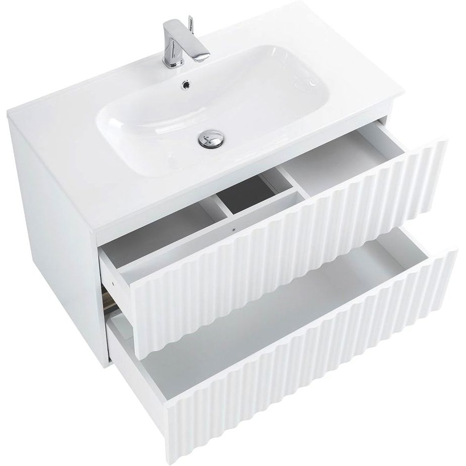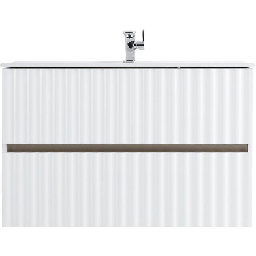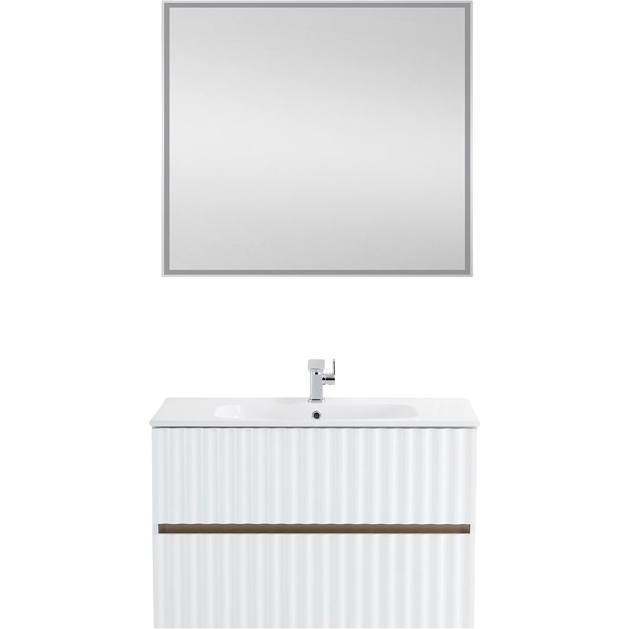 Тумба для комплекта Art&Max Elegant 90 белая глянцевая имеет размеры 90x46,9x55 см и выполнена из МДФ с пленочным покрытием, оснащена ящиками с механизмом плавного закрывания и внешней подсветкой. Габариты мебельной раковины — 91x18,5 см, изготовлена из прочного фарфора, оснащена встроенным слив-переливом и поддерживает сифон диаметром 3.2 см. Зеркало Art&Max Catania 90х80, также подвесное, с сенсорным выключателем и регулируемой подсветкой, выполнено из прочного пластика.
