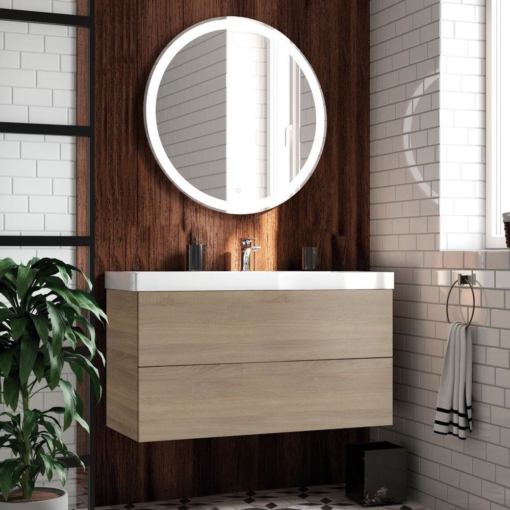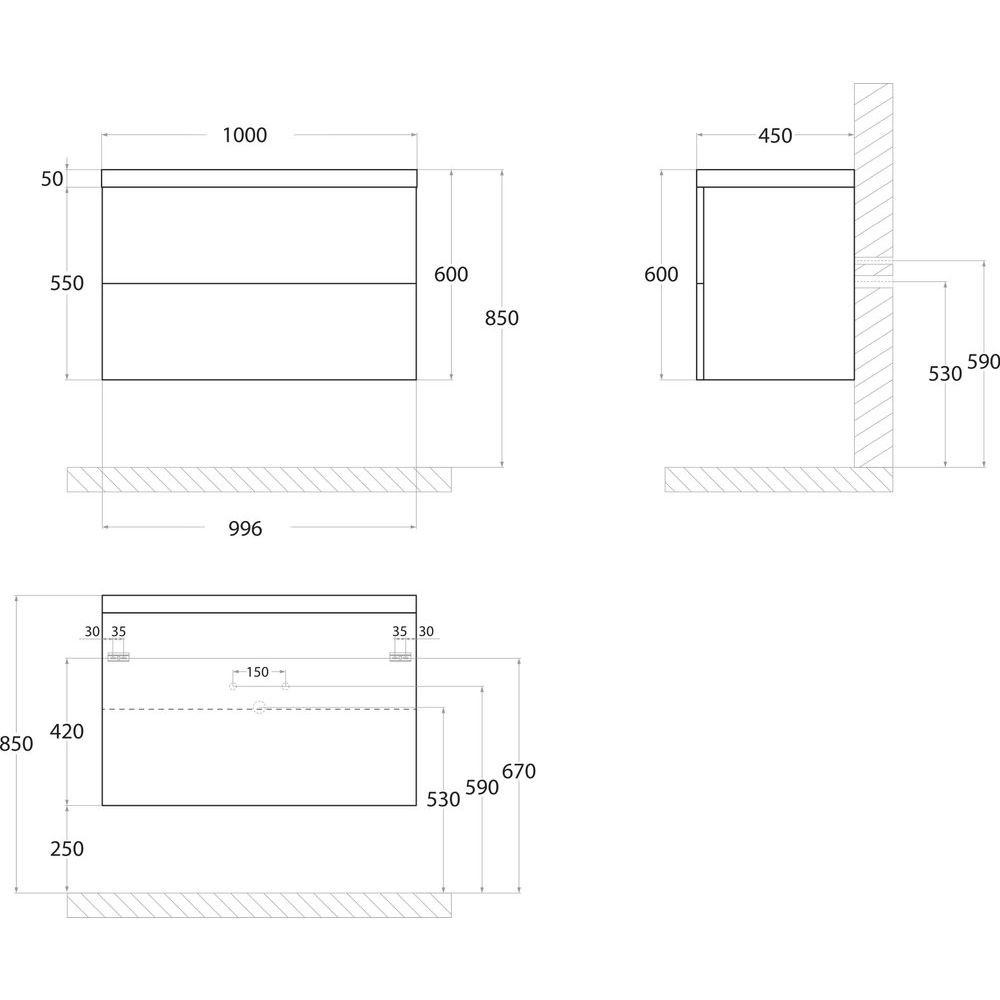 Тумба из комплекта с размерами 99,6x45x55 см подвешивается на стену, что облегчает уборку в ванной и делает интерьер более визуально просторным. Материалы — ДСП, покрытое пленкой и ламинатом, что продлевает срок службы изделия. Раковина изготовлена из искусственного мрамора с размерами 100x45 см и оснащена сливом-переливом, для сифона диаметром 3.2 см. В зону зеркала входят пластик и алюминий, а также предусмотрена современная сенсорная подсветка.