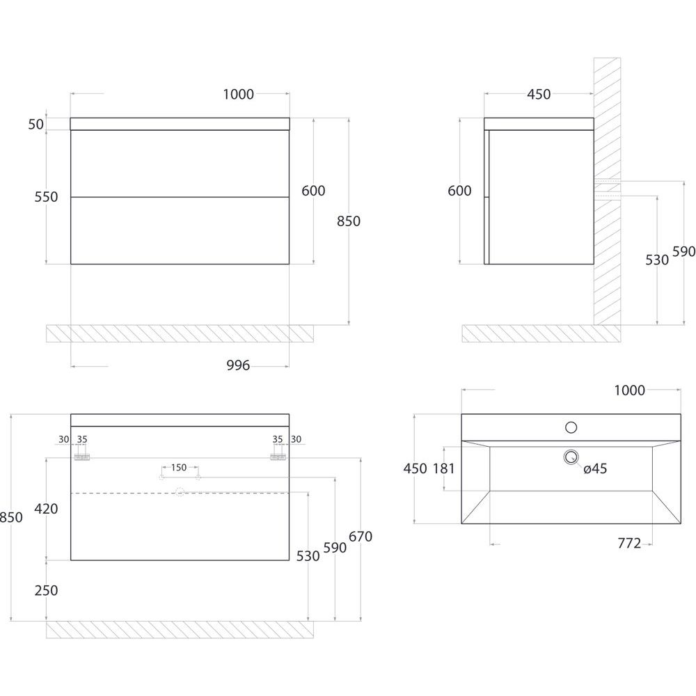 Комплект включает тумбу из ЛДСП/ДСП с ламинатным покрытием, которая дополнена фасадами из МДФ, покрытыми пленкой. Для вашего удобства ящики оснащены нажимным механизмом открывания и доводчиками для плавного закрывания. Габариты тумбы составляют 99,6x45x55 см, и она предназначена для подвесного монтажа.