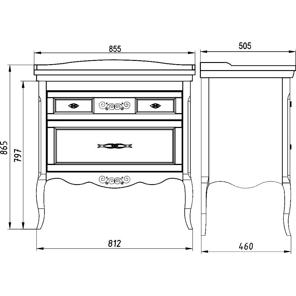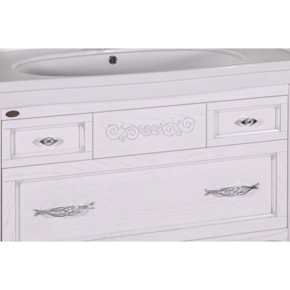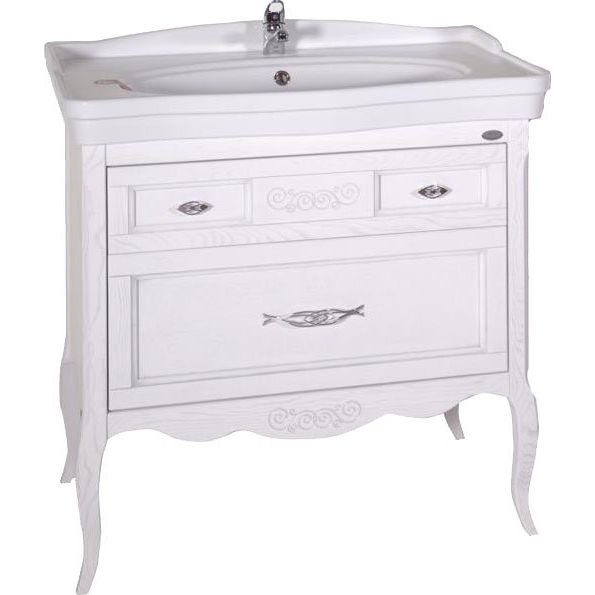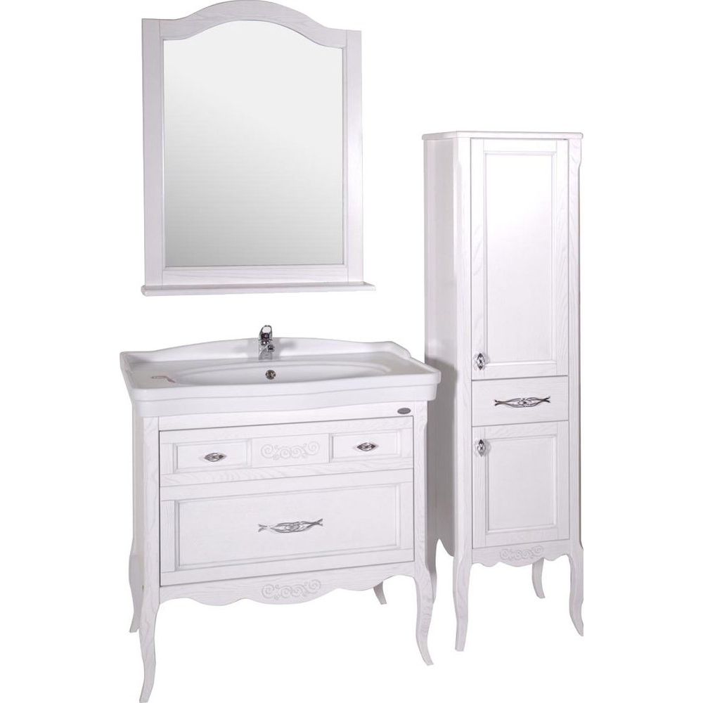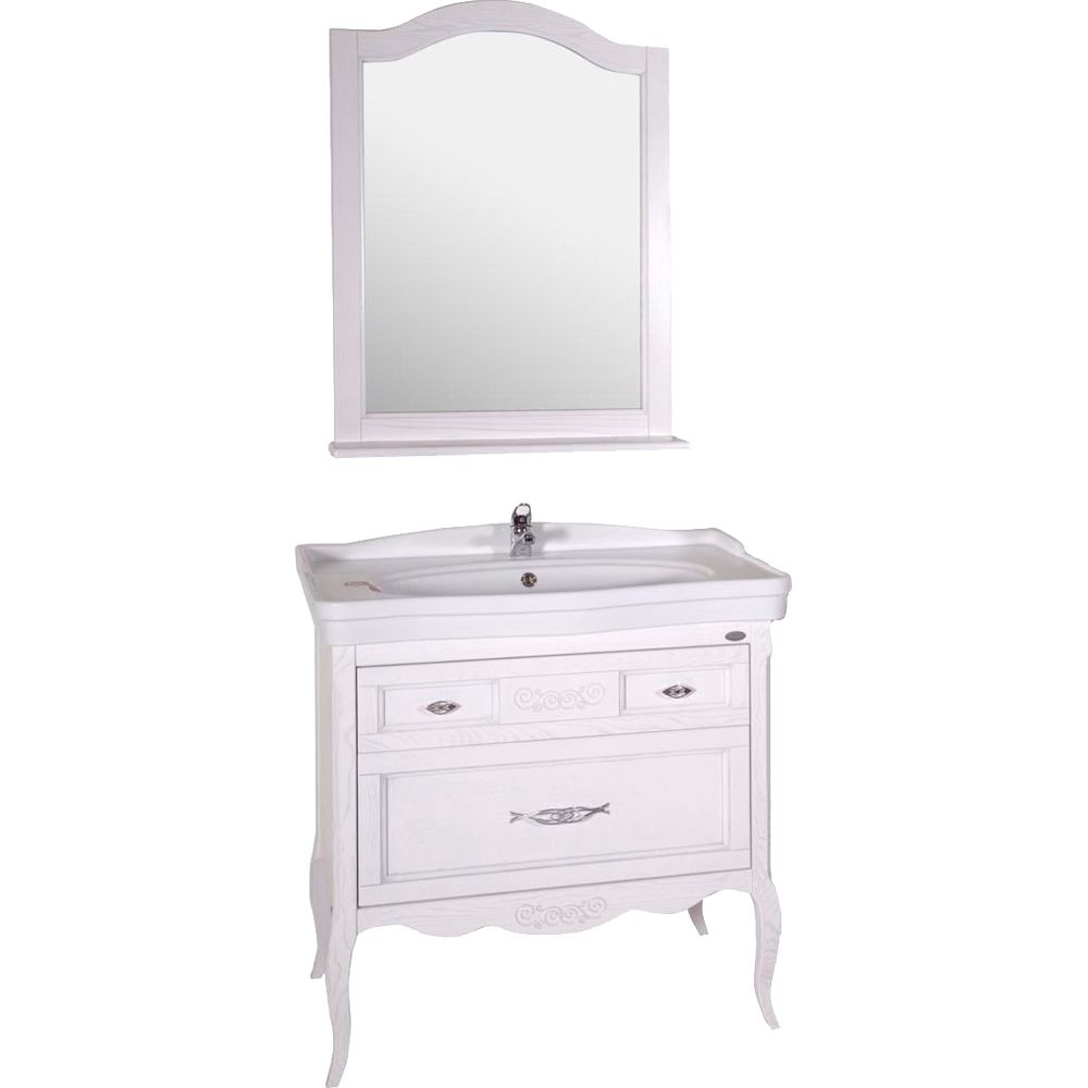 Гарнитур включает в себя напольную тумбу размером 81,2x46x79,7 см, выполненную из массива ясеня с нанесенной патиной серебро, оснащенную ящиками с механизмом доводчика и хромированной фурнитурой. Комплект дополняет раковина Kirovit Модерн 85 из фаянса (86x50,5 см) со сливом-переливом и одно отверстие под смеситель. Раковина требует отдельного приобретения донного клапана. Особым акцентом выступает зеркало размером 69x13x95 см, также из массива ясеня и подвесное, в комплекте с полкой.