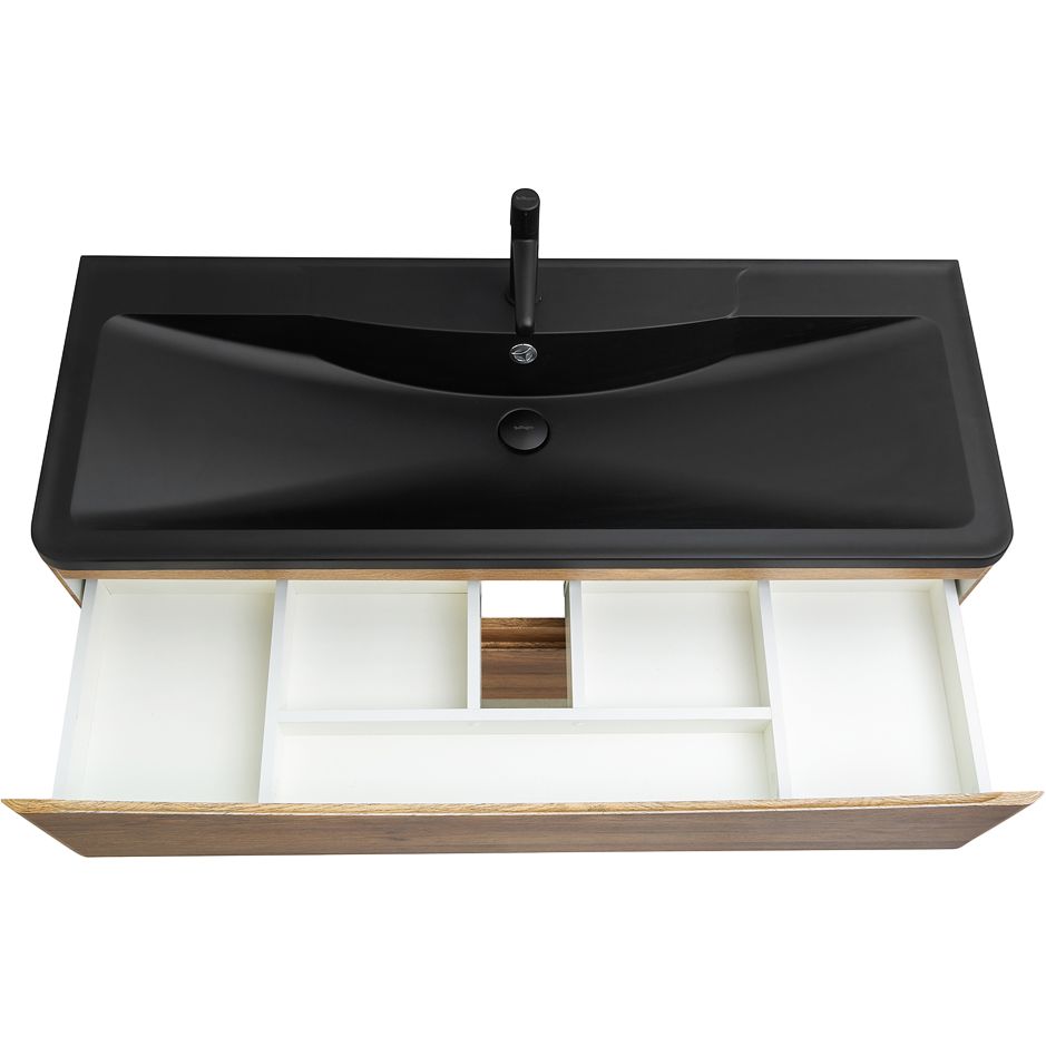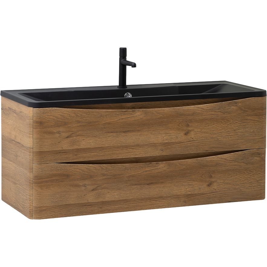 Тумба подвесная размером 120x45,5x50 см выполнена из МДФ с пленочным покрытием, что обеспечивает долговечность и устойчивость к влаге. В ее конструкции предусмотрены ящики с механизмами доводчика для плавного закрывания.