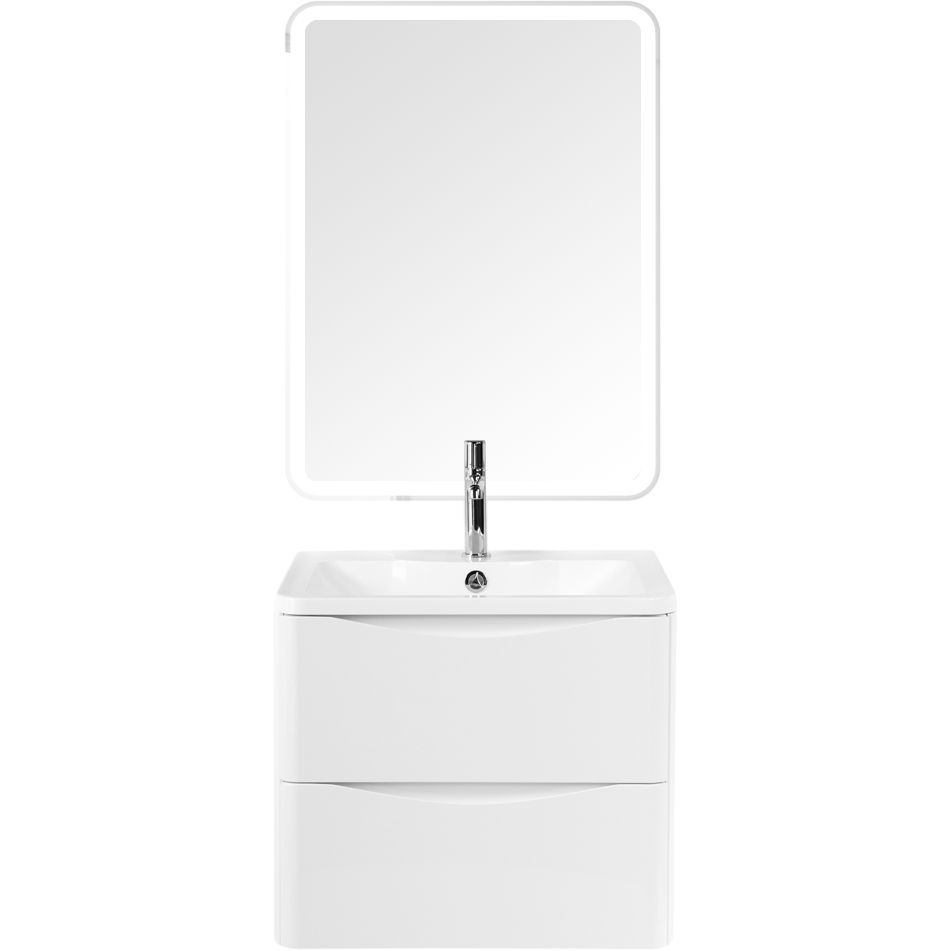 Комплект включает подвесную тумбу из МДФ с покрытием из пленки, размером 69,6x45,5x50 см. Она оснащена современными механизмами доводчика, которые защищают мебель от износа. Дополнив ее раковиной из литьевого мрамора с готовым отверстием для смесителя и обязательным слив-переливом, вы получите функциональное решение для вашей ванной комнаты. Зеркало, размером 80x3x70 см, кроме стильной подсветки, дополняется сенсорным выключателем для удобства использования.