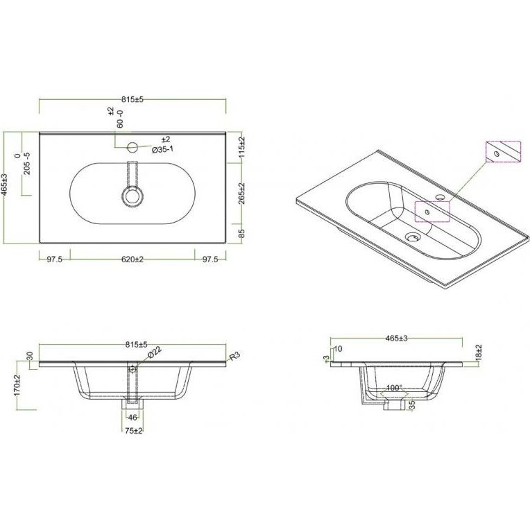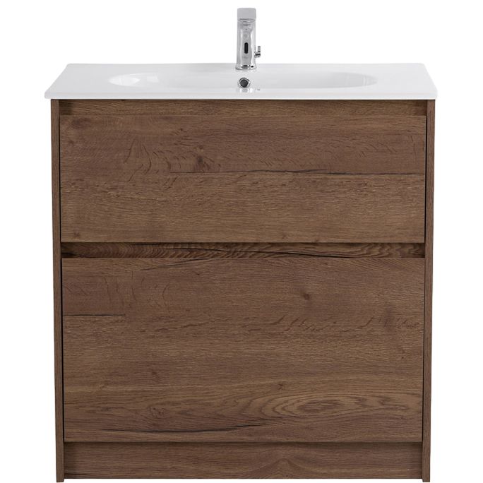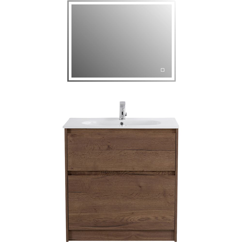 Тумба из ЛДСП с ламинированным покрытием размером 80x46x83 см удобна для монтажа, оснащена механизмом, обеспечивающим плавное закрывание ящиков. В комплекте идет мебельная раковина из фаянса размером 81,5x46,5 см с одним отверстием под смеситель и встроенным сливом-переливом. Зеркало 80x3x70 см с сенсорным выключателем и LED-подсветкой добавит комнате яркости и современности. Все элементы выполнены в Италии и имеют гарантию от производителя.