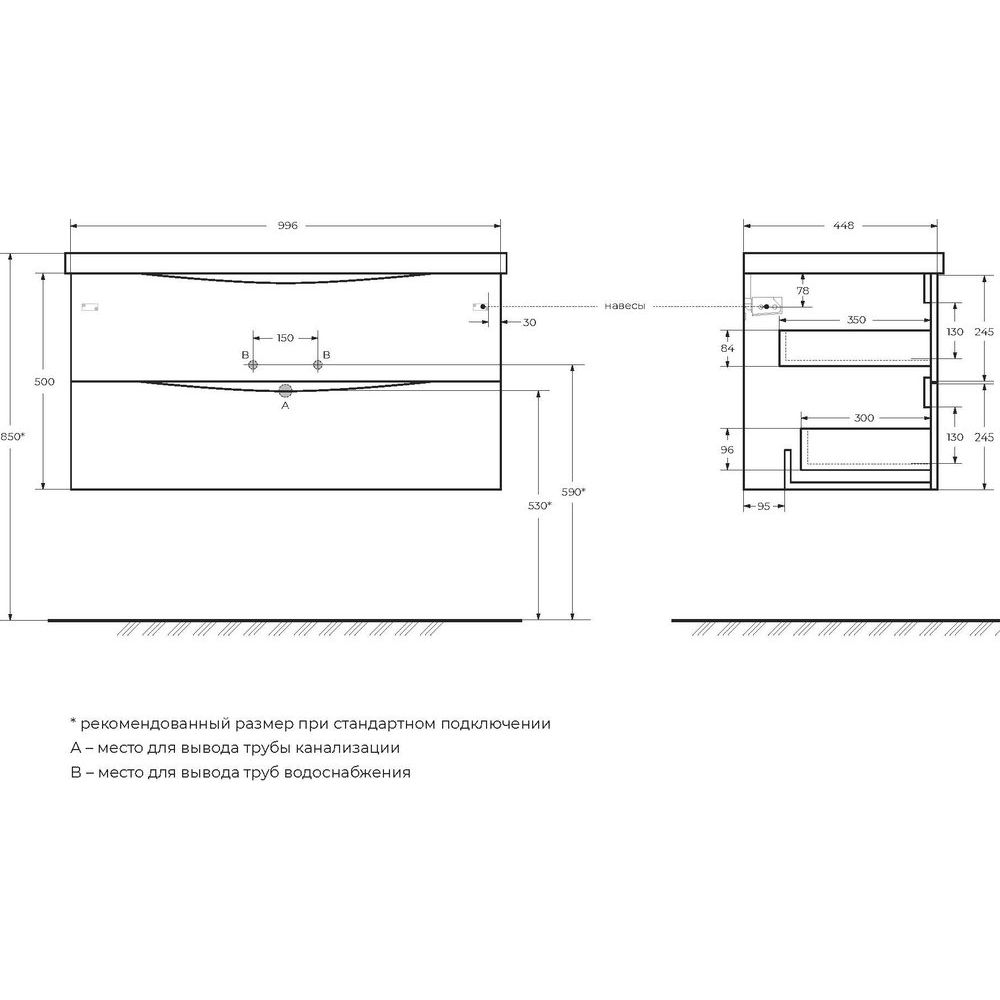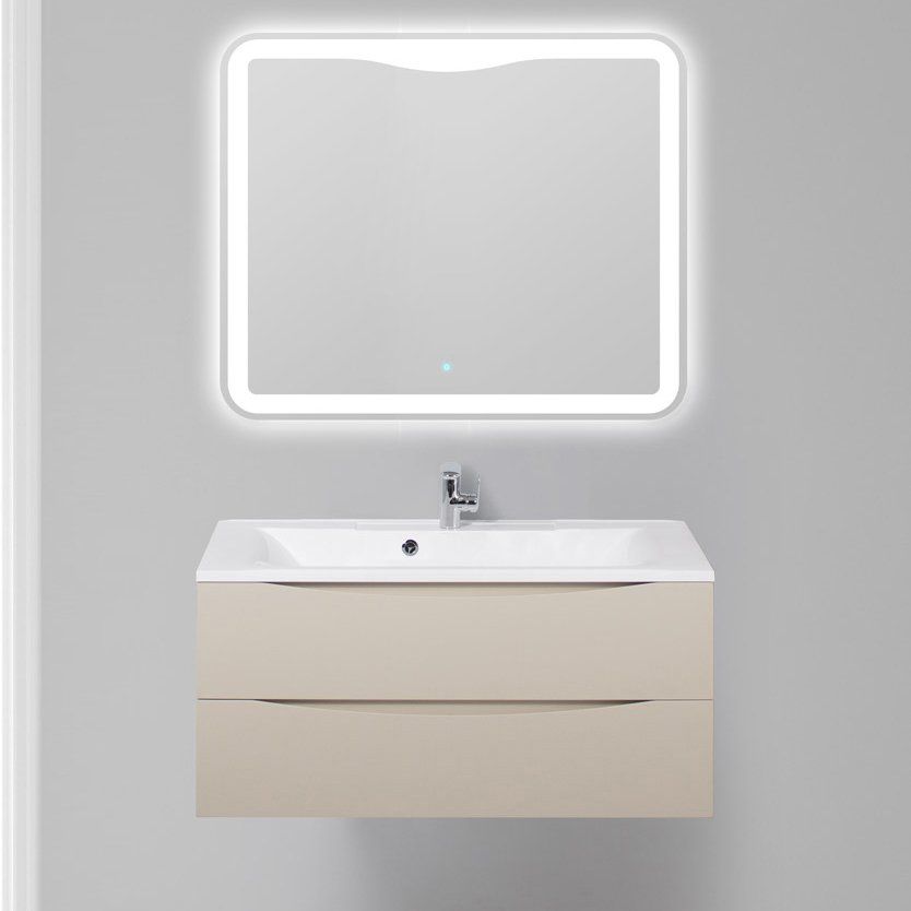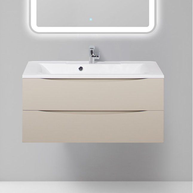 Тумба обладает размерами 99,6x44,8x50 см, она подвесная и оснащена ящиками с доводчиками, обеспечивающими плавное и бесшумное закрытие. Мебельная раковина с параметрами 100x44,5 см изготовлена из искусственного камня и предназначена для сифона 3.2 см. Имеет слив-перелив с декоративной накладкой и предоставляет одно отверстие для смесителя. Зеркало размером 100x3x80 см снабжено стильной LED-подсветкой и сенсорным выключателем. Вам будет приятно управлять освещением одним касанием. Вся мебель произведена в Италии и обладает гарантией 2 года, зеркало — 1 год.