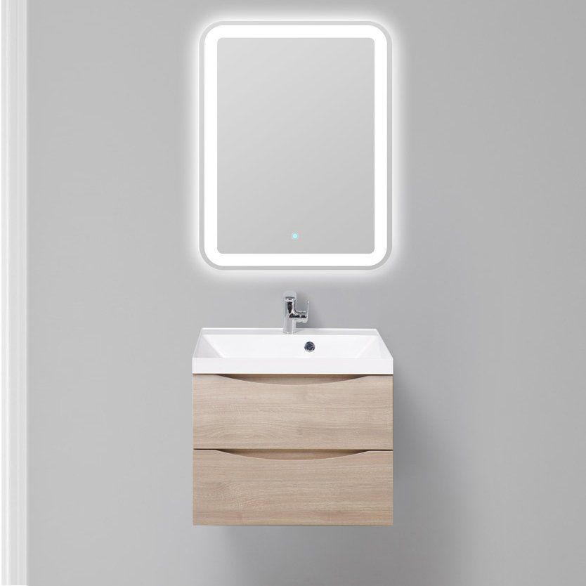 Подвесная тумба BelBagno Marino выполнена из МДФ с прочным плёночным покрытием, её габариты составляют 59,6х44,8х50 см. Тумба имеет встроенный механизм доводчика, обеспечивающий плавное закрывание, что повышает комфорт использования. Мебельная раковина сделана из искусственного камня, её размеры — 60x45 см, оснащена слив-переливом и готовым отверстием под смеситель (диаметр сифона — 3.2 см). Зеркало размером 80х3х60 см оборудовано интегрированной LED-подсветкой и сенсорным выключателем для лёгкого управления. Гарантия на мебель и раковину составляет 2 года, на зеркало — 1 год. Производство — Италия.