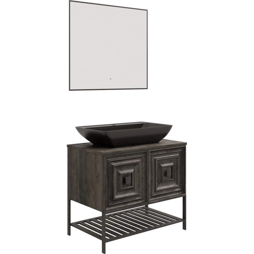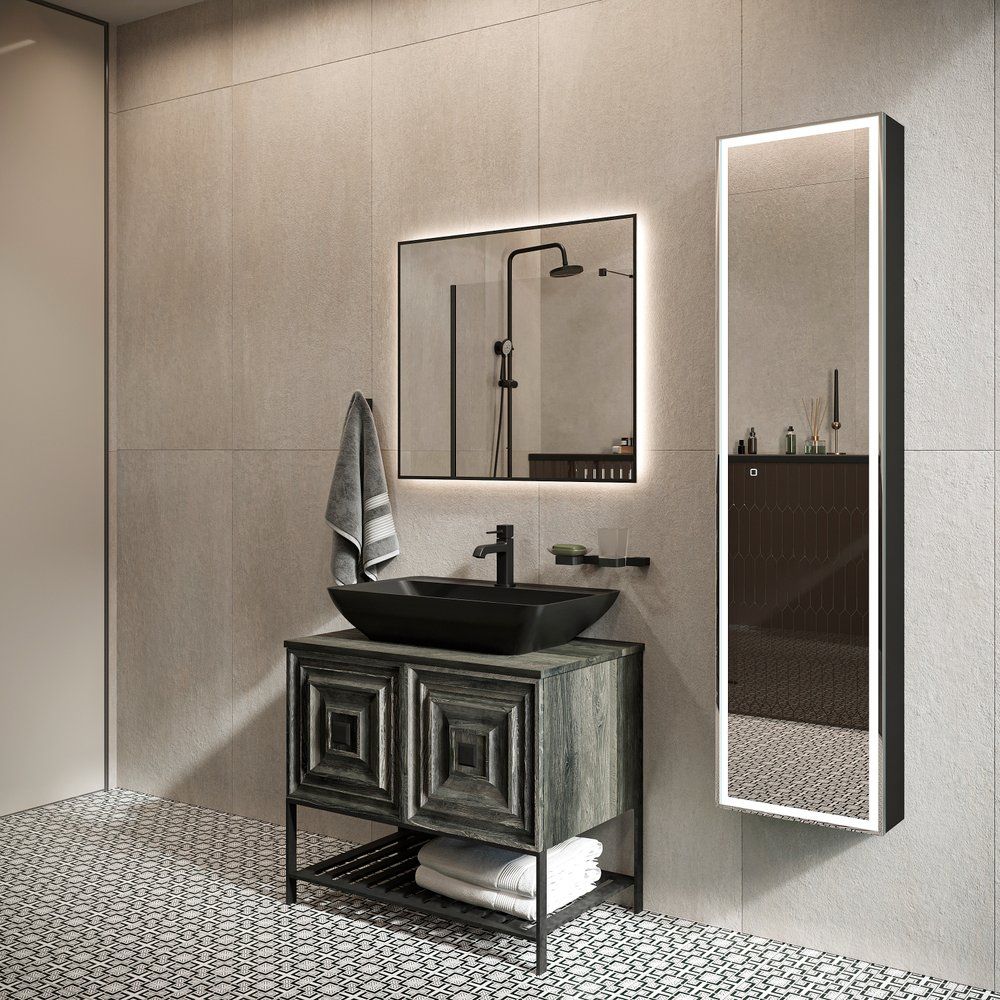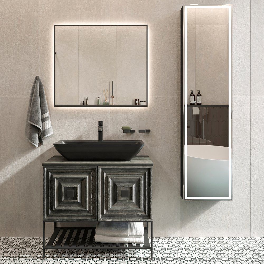 Гарнитур включает тумбу с раковиной Belinza Rustica размерами 80x50x71 см. Тумба крепится к стене и имеет опору на ножках для надежности. Корпус мебели изготовлен из МДФ с металлическими элементами и покрыт эмалью для долговечности. Фасад выполнен из МДФ с эмалированным покрытием. Комплект поставляется со столешницей и открытыми полками, без отверстий под смеситель. Зеркало DIWO Элиста с черным корпусом и подсветкой размерами 80x3x70 см, подвесное, изготовлено из пластика с функцией инфракрасного выключателя. Гарантия на все элементы составляет 2 года.