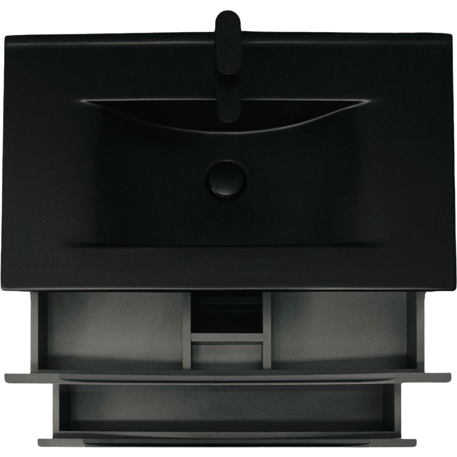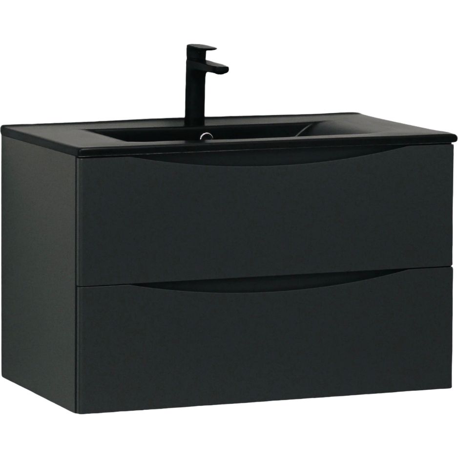 Тумба в комплекте BOND Cube T01807 имеет размеры 80x45,5x50 см и оснащена механизмом доводчика, который обеспечивает мягкое закрывание ящиков. Корпус и фасад выполнены из МДФ и покрыты эмалью, что обеспечивает их долговечность и устойчивость к влаге. Черная раковина BOND Cube S05-808 размером 80x46 см изготовлена из фарфора, имеет встроенный слив-перелив и одно отверстие для установки смесителя. Зеркало круглое STWORKI Молде дополняет гарнитур, имеет размеры 80x1,6x80 см, выполнено из МДФ с антрацитовым матовым покрытием и имеет подвесы для удобной установки.