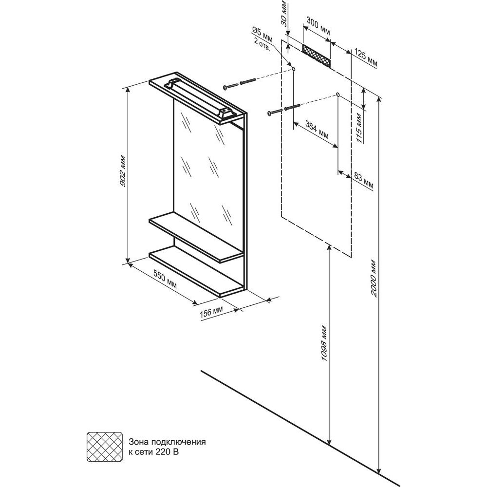 - Зеркало: оснащено встроенной подсветкой и розеткой, материал корпуса ДСП с ламинатом, механический выключатель, подвесное крепление.