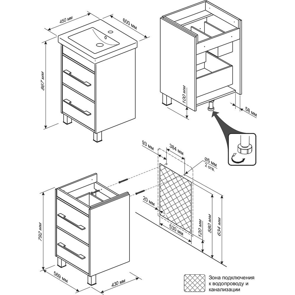 Уважаемые покупатели! При установке умывальника обратите внимание: тумбу необходимо сначала прикрепить к стене. Обратите внимание на необходимость приобретения шкафа-пенала отдельно. Важно также учитывать конструкцию тумбы при подборе сифона. Комплект поставляется с опорными ножками для стабильности и надежности конструкции.