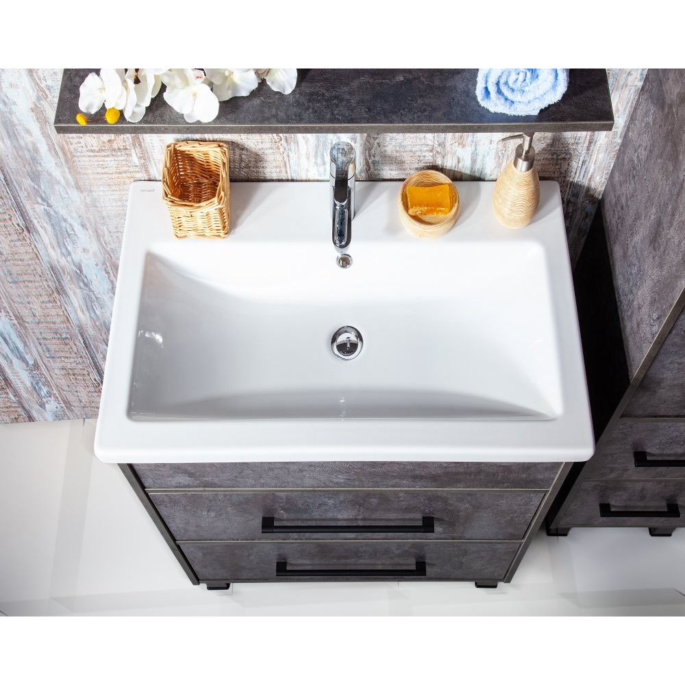 Гарнитур включает тумбу с габаритами 56,9x43x79,2 см, выполненную из ЛДСП и ДСП с ламинатным покрытием. Тумба крепится к стене и имеет дополнительные опорные ножки, однако механизм доводчика ящиков отсутствует. В комплект входит подвесная раковина Cersanit Como 60 из фарфора, размером 60x45 см, с встроенным сливом-переливом и готовым отверстием под смеситель. Донный клапан приобретается отдельно. Зеркало Бриклаер Чили с подсветкой имеет габариты 55x15,6x90,2 см и оснащено механическим выключателем и розеткой, предоставляя удобство пользования и дополнительное освещение.