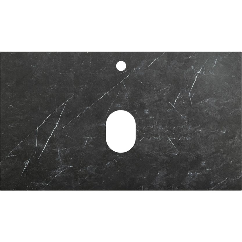 Столешница выполнена из прочного керамогранита в черном цвете, размер 80x46x2 см. Она имеет отверстие для установки раковины, но не имеет отверстий под смеситель.