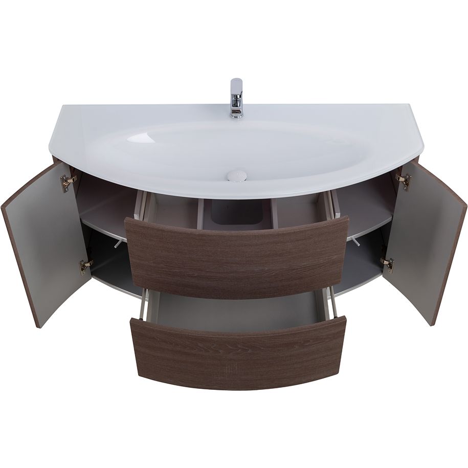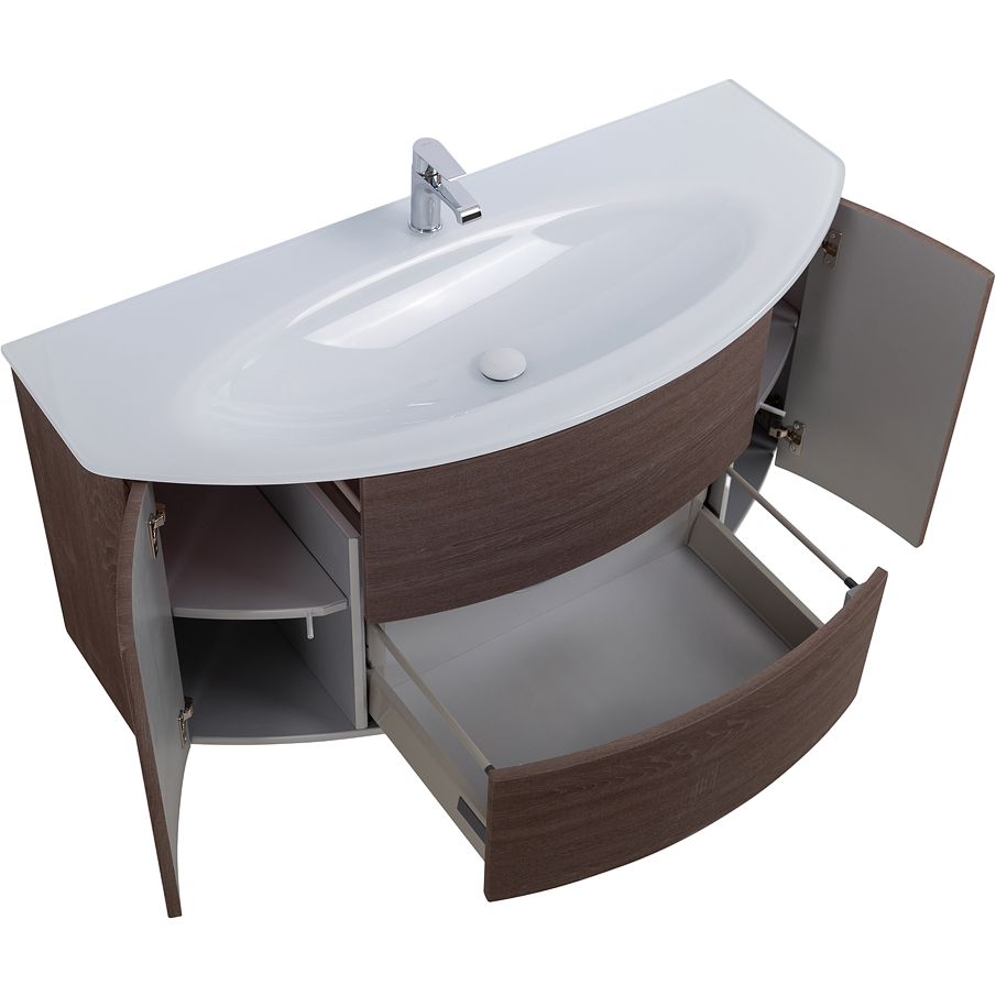 Мебельный гарнитур Cezares Eden включает подвесную тумбу размером 121x51x55 см, выполненную из МДФ с пленочным покрытием, и оснащенную доводчиками для мягкого закрывания. Элегантная раковина Extra Light имеет размеры 122x52 см и выполнена из высококачественного стекла, предусмотрено отверстие под смеситель. Зеркало размером 120x3x80 см оснащено энергосберегающей подсветкой и инфракрасным выключателем для комфортного использования.