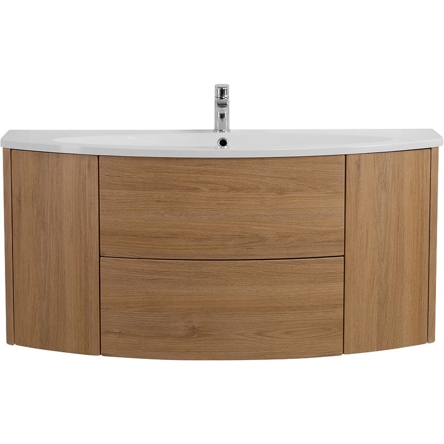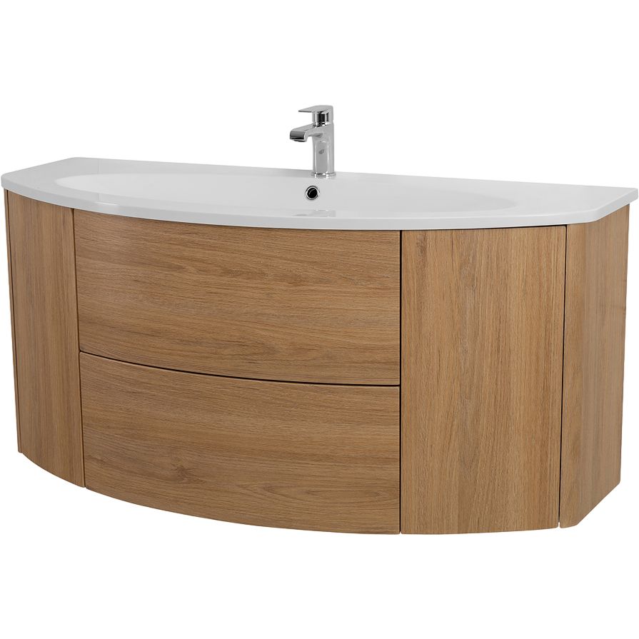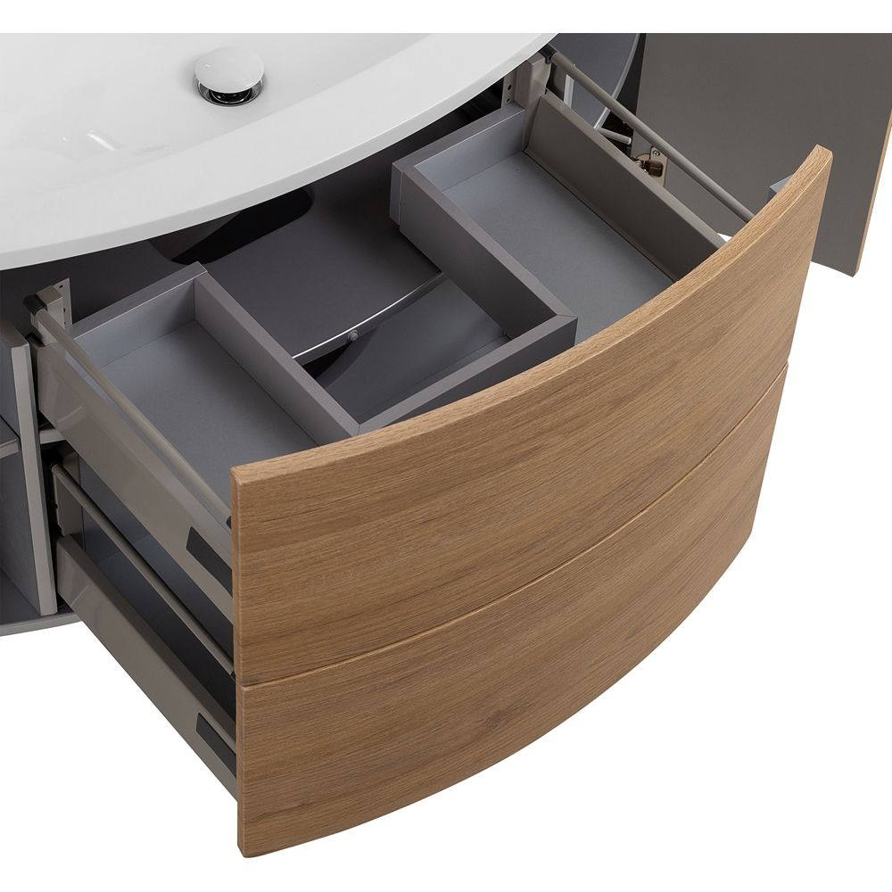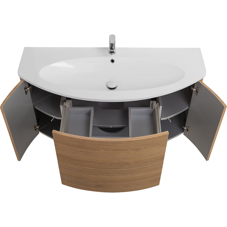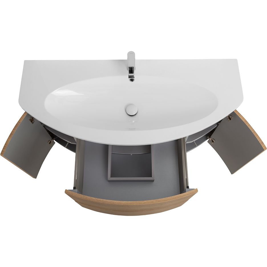 - Современные материалы и технологии: МДФ с пленочным покрытием для корпуса и фасада тумбы, искусственный камень для раковины.