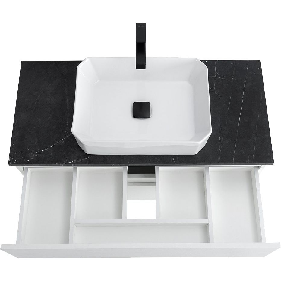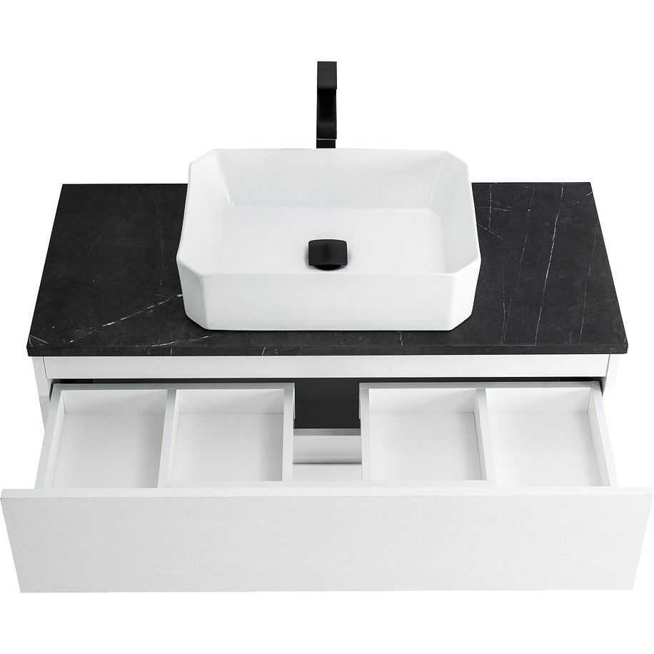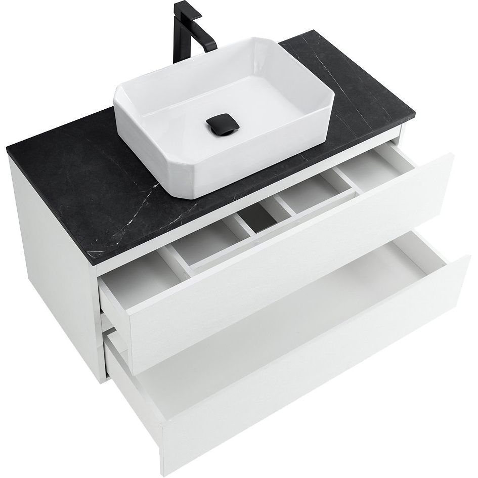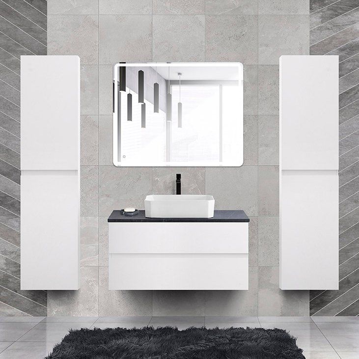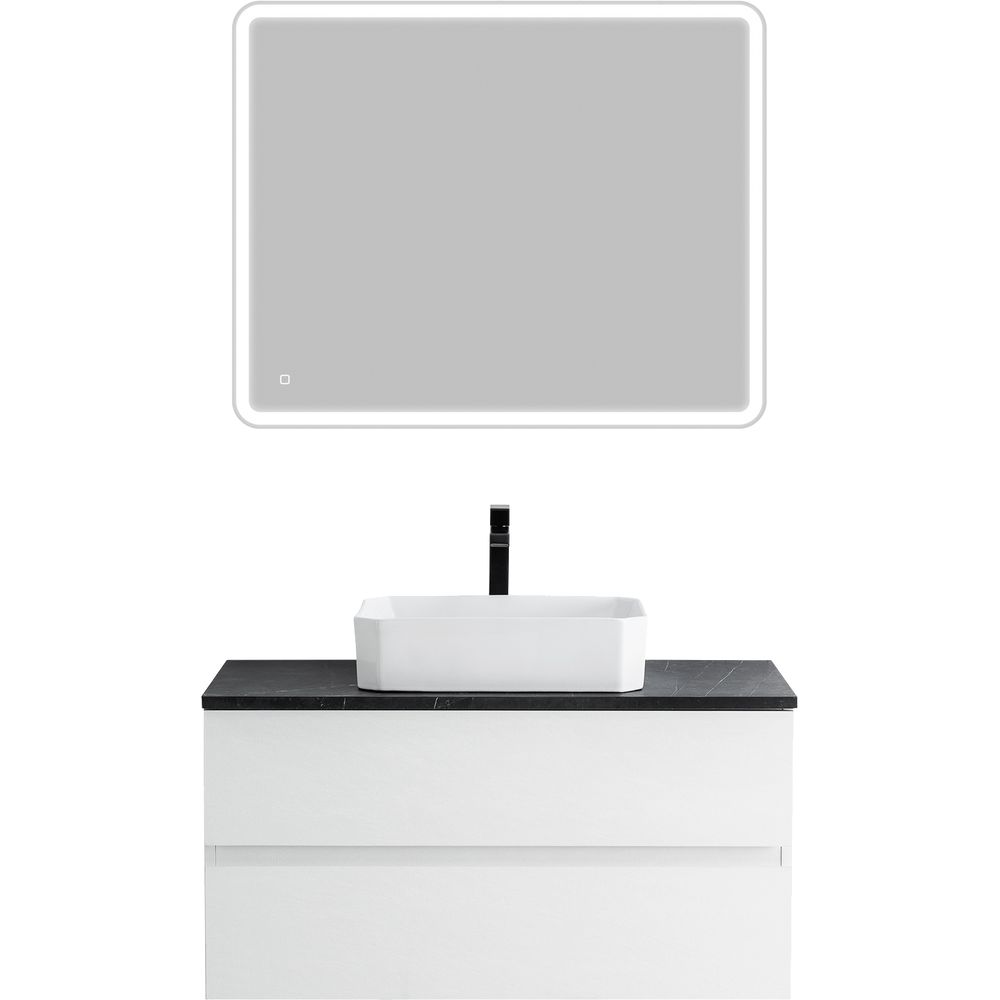 Комплект включает подвесную тумбу Cezares Molveno из ЛДСП с ламинатным покрытием. Ящики тумбы оснащены механизмом доводчика, что обеспечивает легкое закрывание. Габариты тумбы составляют 99,7x46x50 см. Накладная раковина BelBagno BB1386 изготовлена из фаянса и рассчитана на сифон диаметром 3.2 см. Для установки раковины предусмотрена столешница BelBagno из керамогранита в цвете "черный мрамор". Зеркало со встроенной светодиодной подсветкой и сенсорным выключателем станет изюминкой ванной комнаты.
