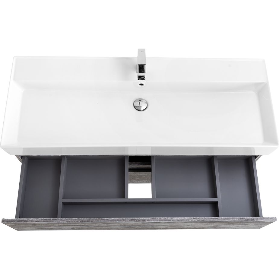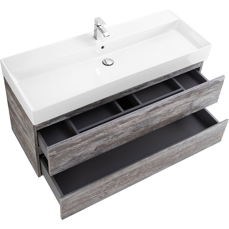 Тумба для комплекта Cezares Molveno 46 120 legno grigio, изготовленная из ЛДСП, имеет размеры 119,7x46x50 см и покрыта износостойким ламинатом. Подвесная конструкция и наличие механизма доводчика делают её ещё более привлекательной для пользователей. Мебельная раковина из фаянса имеет размеры 121,2x46,6 см и оснащена одним отверстием под смеситель, диаметром слива 3,2 см. Зеркало BelBagno размером 120x3x80 см укомплектовано LED-подсветкой и сенсорным выключателем для удобного использования. Все элементы гарнитура производятся в Италии и идут с гарантией на один год.